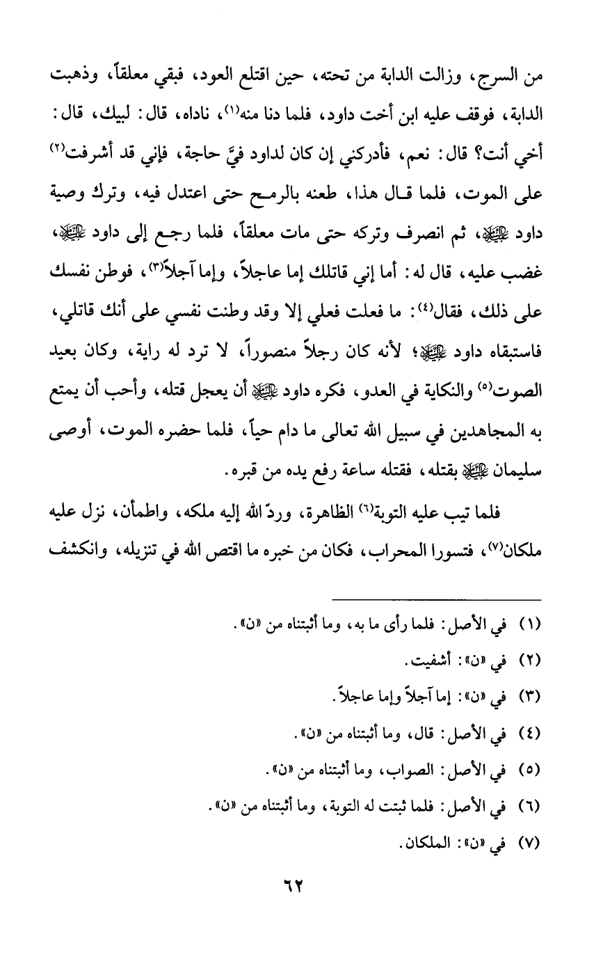 من السرج، وزالت الدابة من تحته، حين اقتلع العود، فبقي معلقاً، وذهبت الدابة، فوقف عليه ابن أخت داود، فلما دنا منه، ناداه، قال: لبيك، قال: أخي أنت؟ قال: نعم، فأدركني إن كان لداود في حاجة، فإني قد أشرفت على الموت، فلما قال هذا، طعنه بالرمح حتى اعتدل فيه، وترك وصية داود عليه السلام، ثم انصرف وتركه حتى مات معلقاً، فلما رجع إلى داود عليه السلام، غضب عليه، قال له: أما إني قاتلك إما عاجلاً، وإما آجلاً، فوطن نفسك على ذلك، فقال: ما فعلت فعلي إلا وقد وطنت نفسي على أنك قاتلي، فاستبقاه داود عليه السلام؛ لأنه كان رجلاً منصوراً، لا ترد له راية، وكان بعيد الصوت والنكاية في العدو، فكره داود عليه السلام أن يعجل قتله، وأحب أن يمتع به المجاهدين في سبيل الله تعالى ما دام حياً، فلما حضره الموت، أوصى سليمان عليه السلام بقتله، فقتله ساعة رفع يده من قبره.