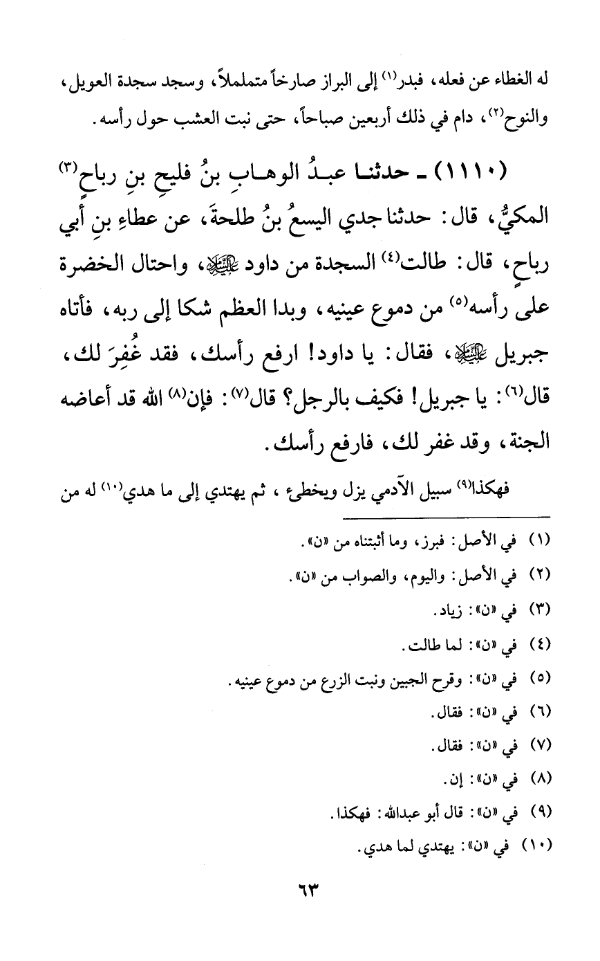 1110 - حدثنا عبد الوهاب بن فليح بن رباحٍ المكي، قال: حدثنا جدي اليسع بن طلحة، عن عطاء بن أبي رباحٍ، قال: طالت السجدة من داود عليه السلام، واحتال الخضرة على رأسه من دموع عينيه، وبدا العظم شكا إلى ربه، فأتاه جبريل عليه السلام، فقال: يا داود! ارفع رأسك، فقد غفر لك، قال: يا جبريل! فكيف بالرجل؟ قال: فإن الله قد أعاضه الجنة، وقد غفر لك، فارفع رأسك.