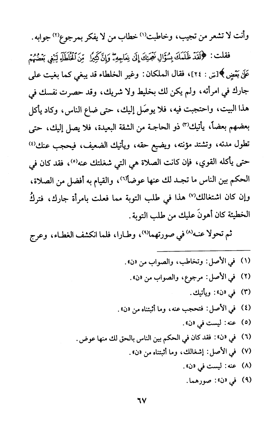 فقلت: {لقد ظلمك بسؤال نعجتك إلى نعاجه وإن كثيراً من الخلطاء ليبغي بعضهم على بعضٍ}، فقال الملكان: وغير الخلطاء قد يبغي كما بغيت على جارك في امرأته، ولم يكن لك بخليط ولا شريك، وقد حصرت نفسك في هذا البيت، واحتجبت فيه، فلا يوصل إليك، حتى ضاع الناس، وكاد يأكل بعضهم بعضاً، يأتيك ذو الحاجة من الشقة البعيدة، فلا يصل إليك، حتى تطول مدته، وتشتد مؤنته، ويضيع حقه، ويأتيك الضعيف، فيحجب عنك حتى يأكله القوي، فإن كانت الصلاة هي التي شغلتك عنه، فقد كان في الحكم بين الناس ما تجد لك عنها عوضاً، والقيام به أفضل من الصلاة، وإن كان اشتغالك هذا في طلب التوبة مما فعلت بامرأة جارك، فترك الخطيئة كان أهون عليك من طلب التوبة.