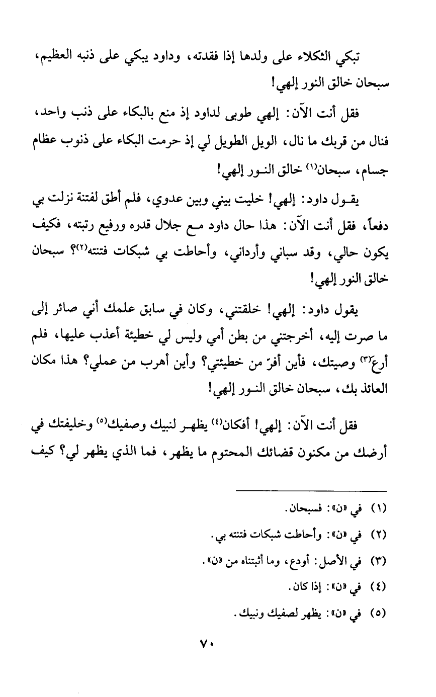 فقل أنت الآن: إلهي طوبى لداود إذ منع بالبكاء على ذنب واحد، فنال من قربك ما نال، الويل الطويل لي إذ حرمت البكاء على ذنوب عظام جسام، سبحان خالق النور إلهي!