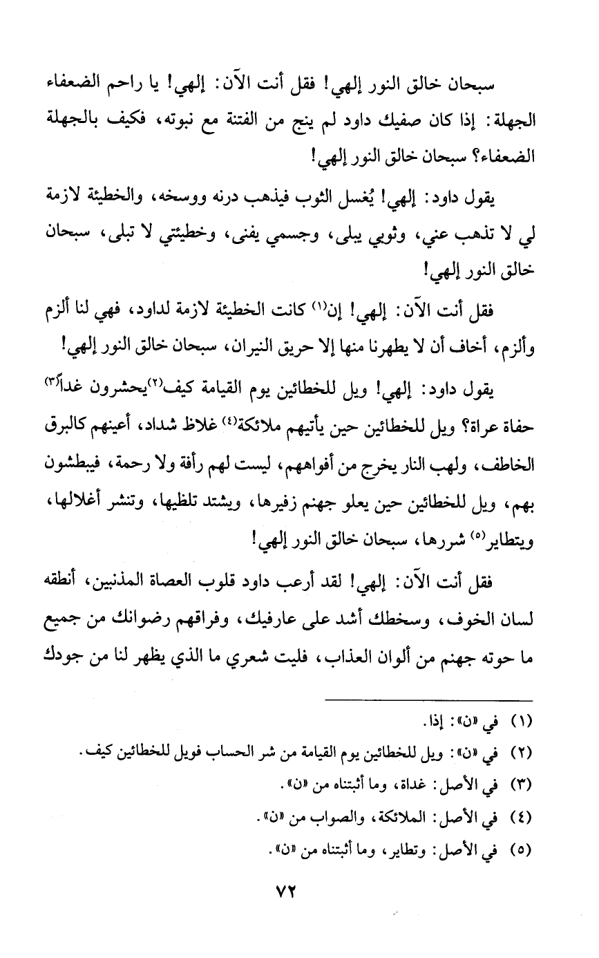 سبحان خالق النور إلهي! فقل أنت الآن: إلهي! يا راحم الضعفاء الجهلة: إذا كان صفيك داود لم ينج من الفتنة مع نبوته، فكيف بالجهلة الضعفاء؟ سبحان خالق النور إلهي!
