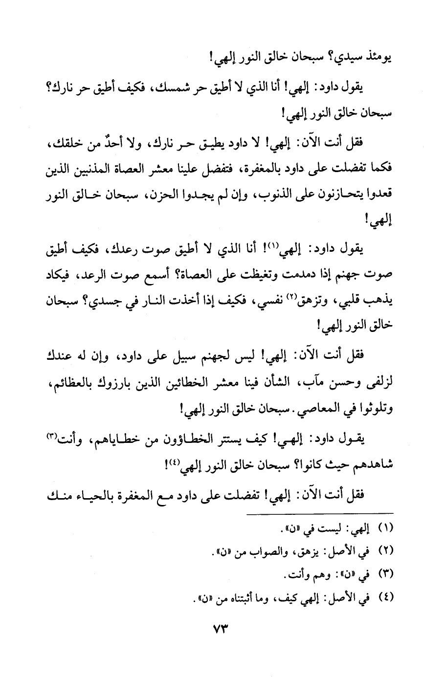 فقل أنت الآن: إلهي! لا داود يطيق حر نارك، ولا أحدٌ من خلقك، فكما تفضلت على داود بالمغفرة، فتفضل علينا معشر العصاة المذنبين الذين قعدوا يتحازنون على الذنوب، وإن لم يجدوا الحزن، سبحان خالق النور إلهي!