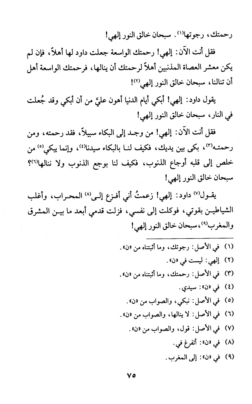 فقل أنت الآن: إلهي! رحمتك الواسعة جعلت داود لها أهلاً، فإن لم يكن معشر العصاة المذنبين أهلاً لرحمتك أن ينالها، فرحمتك الواسعة أهل أن تنالنا، سبحان خالق النور إلهي!