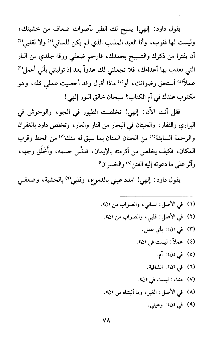 يقول داود: إلهي! يسبح لك الطير بأصوات ضعاف من خشيتك، وليست لها ذنوب، وأنا العبد المذنب الذي لم يكن للساني ولا لقلبي أن يفترا من ذكرك والتسبيح بحمدك، فارحم ضعفي ورقة جلدي من النار التي تعذب بها أعداءك، فلا تجعلني لك عدواً بعد إذ توليتني بأني أعمل عملاً أستحق رضوانك، أو ماذا أقول وقد أحصيت عملي كله، وهو مكتوب عندك في أم الكتاب؟ سبحان خالق النور إلهي!