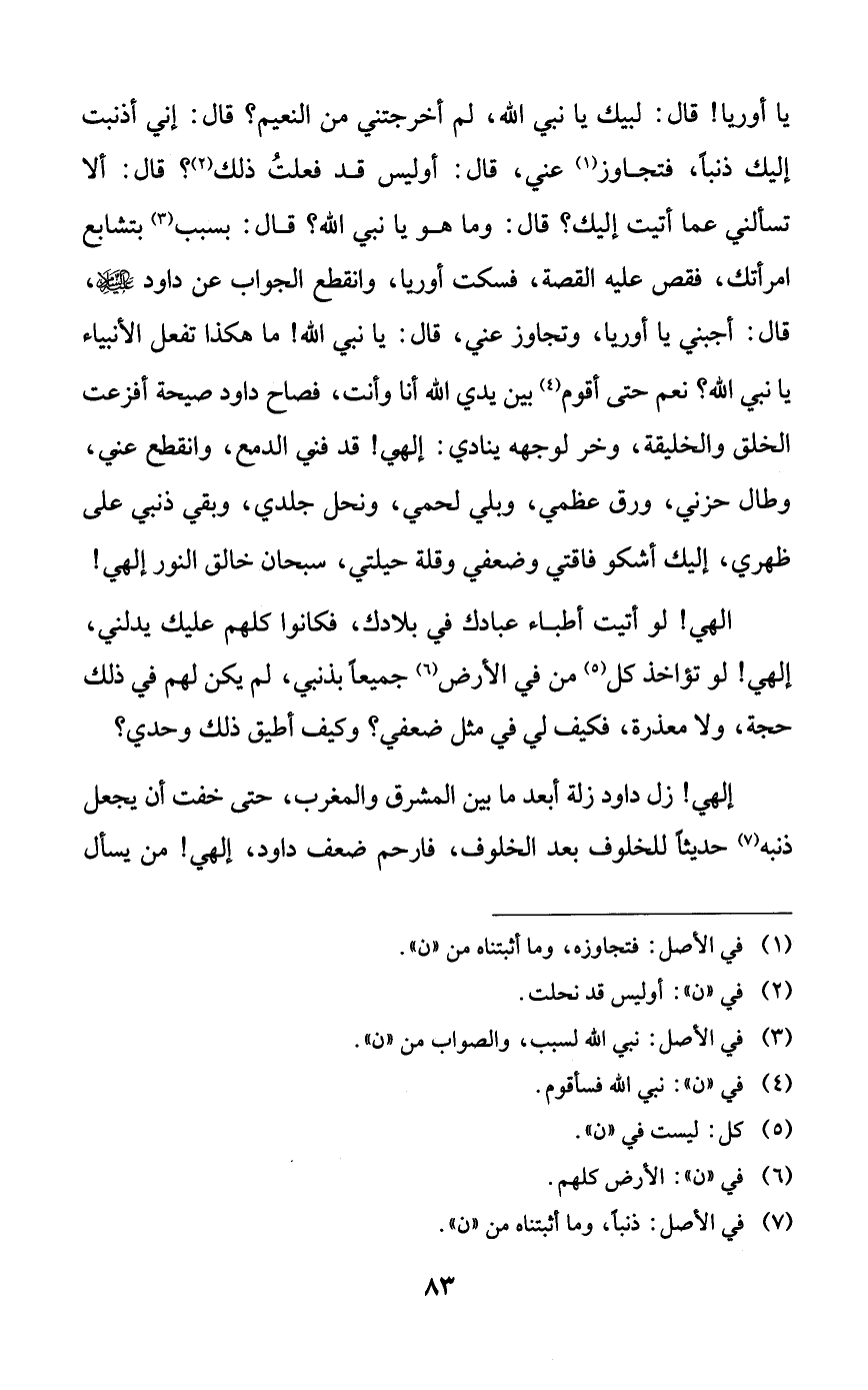 يا أوريا! قال: لبيك يا نبي الله، لم أخرجتني من النعيم؟ قال: إني أذنبت إليك ذنباً، فتجاوز عني، قال: أوليس قد فعلت ذلك؟ قال: ألا تسألني عما أتيت إليك؟ قال: وما هو يا نبي الله؟ قال: بسبب بتشابع امرأتك، فقص عليه القصة، فسكت أوريا، وانقطع الجواب عن داود عليه السلام، قال: أجبني يا أوريا، وتجاوز عني، قال: يا نبي الله! ما هكذا تفعل الأنبياء يا نبي الله؟ نعم حتى أقوم بين يدي الله أنا وأنت، فصاح داود صيحة أفزعت الخلق والخليقة، وخر لوجهه ينادي: إلهي! قد فني الدمع، وانقطع عني، وطال حزني، ورق عظمي، وبلي لحمي، ونحل جلدي، وبقي ذنبي على ظهري، إليك أشكو فاقتي وضعفي وقلة حيلتي، سبحان خالق النور إلهي!