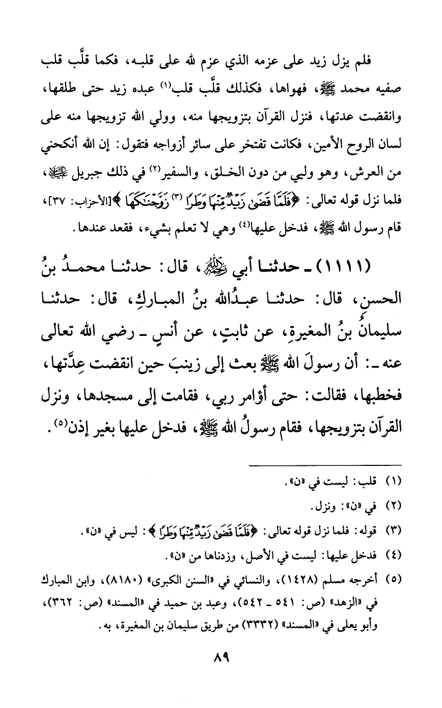1111 - حدثنا أبي رحمه الله، قال: حدثنا محمد بن الحسن، قال: حدثنا عبد الله بن المبارك، قال: حدثنا سليمان بن المغيرة، عن ثابتٍ، عن أنسٍ -رضي الله تعالى عنه-: أن رسول الله صلى الله عليه وسلم بعث إلى زينب حين انقضت عدتها، فخطبها، فقالت: حتى أؤامر ربي، فقامت إلى مسجدها، ونزل القرآن بتزويجها، فقام رسول الله صلى الله عليه وسلم، فدخل عليها بغير إذن.