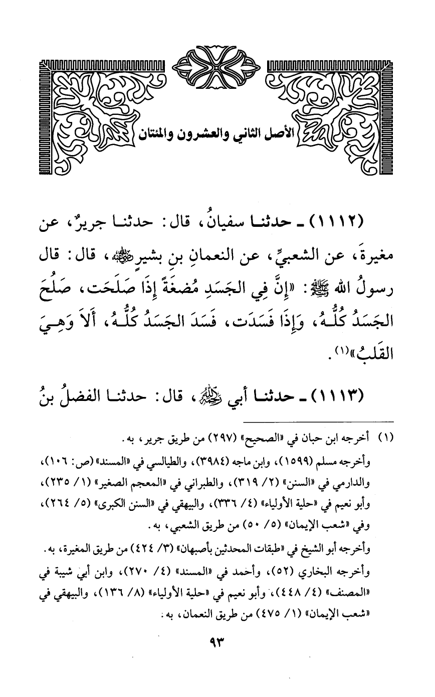 1112 - حدثنا سفيان، قال: حدثنا جريرٌ، عن مغيرة، عن الشعبي، عن النعمان بن بشيرٍ رضي الله عنه، قال: قال رسول الله صلى الله عليه وسلم: ((إن في الجسد مضغةٌ إذا صلحت، صلح الجسد كله، وإذا فسدت، فسد الجسد كله، ألا وهي القلب)).