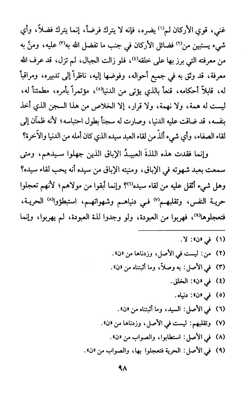 غني، قوي الأركان لم يضره، فإنه لا يترك فرضاً، إنما يترك فضلاً، وأي شيء يستبين من فضائل الأركان في جنب ما تفضل الله به عليه، ومن به من معرفته التي برز بها على خلقه، فلو زالت الجبال، لم تزل، قد عرف الله معرفة، قد وثق به في جميع أحواله، وفوضها إليه، ناظراً إلى تدبيره، ومراقباً له، قابلاً أحكامه، قنعاً بالذي يؤتى من الدنيا، مؤتمراً بأمره، مطمئناً له، ليست له همة، ولا نهمة، ولا قرار، إلا الخلاص من هذا السجن الذي أخذ بنفسه، قد ضاقت عليه الدنيا، وصارت له سجناً بطول احتباسه؛ لأنه ظمآن إلى لقاء الصفاء، وأي شيء ألذ من لقاء العبد سيده الذي كان أمله من الدنيا والآخرة؟