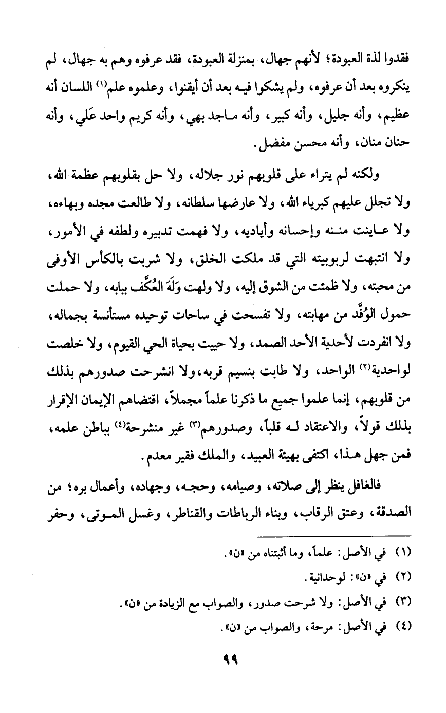 ولكنه لم يتراء على قلوبهم نور جلاله، ولا حل بقلوبهم عظمة الله، ولا تجلل عليهم كبرياء الله، ولا عارضها سلطانه، ولا طالعت مجده وبهاءه، ولا عاينت مننه وإحسانه وأياديه، ولا فهمت تدبيره ولطفه في الأمور، ولا انتبهت لربوبيته التي قد ملكت الخلق، ولا شربت بالكأس الأوفى من محبته، ولا ظمئت من الشوق إليه، ولا ولهت وله العكف ببابه، ولا حملت حمل الوفد من مهابته، ولا تفسحت في ساحات توحيده مستأنسة بجماله، ولا انفردت لأحدية الأحد الصمد، ولا حييت بحياة الحي القيوم، ولا خلصت لواحدية الواحد، ولا طابت بنسيم قربه، ولا انشرحت صدورهم بذلك من قلوبهم، إنما علموا جميع ما ذكرنا علماً مجملاً، اقتضاهم الإيمان الإقرار بذلك قولاً، والاعتقاد له قلباً، وصدورهم غير منشرحة بباطن علمه، فمن جهل هذا، اكتفى بهيئة العبيد، والملك فقير معدم.