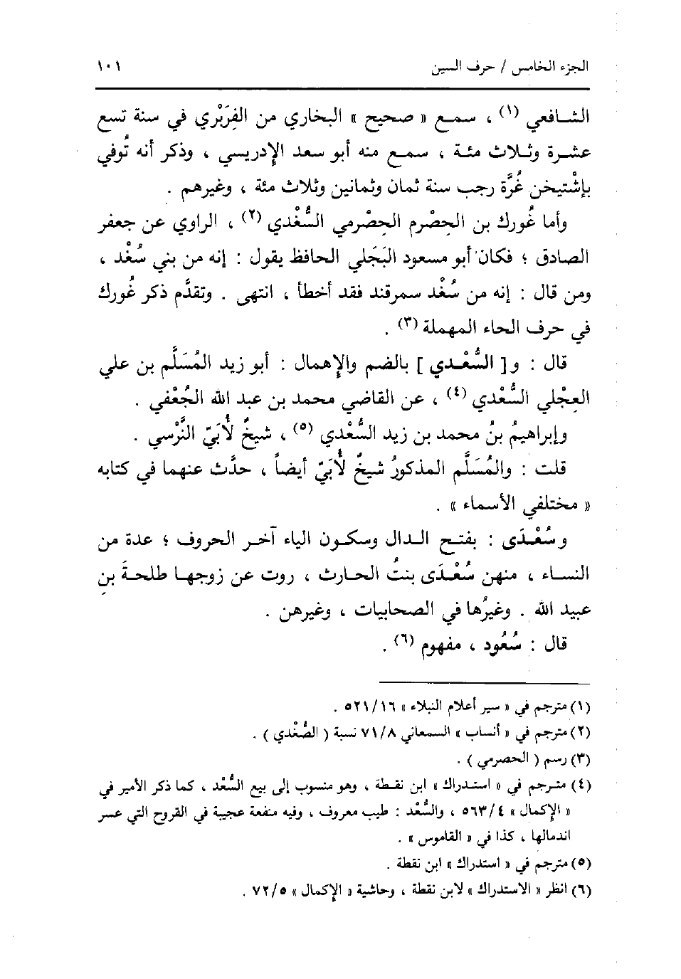 الشَّافِعِي سمع صَحِيح البُخَارِيّ من الْفربرِي فِي سنة تسع عشرَة وَثَلَاث مئة سمع مِنْهُ أَبُو سعد الادريسي وَذكر انه توفّي بإشتيخن غرَّة رَجَب سنة ثَمَان وَثَمَانِينَ وَثَلَاث مئة وَغَيرهم. وَأما غورك بن الحصرم الحصرمي السغدي الرَّاوِي عَن جَعْفَر الصَّادِق فَكَانَ أَبُو مَسْعُود البَجلِيّ الْحَافِظ يَقُول: إِنَّه من بني سغد وَمن قَالَ: انه من سغد سَمَرْقَنْد فقد اخطأ انْتهى. وَتقدم ذكر غورك فِي حرف الْحَاء الْمُهْملَة. قَالَ: و [السَّعْدِيّ] بِالضَّمِّ والاهمال: أَبُو زيد الْمُسلم بن عَليّ الْعجلِيّ السَّعْدِيّ عَن القَاضِي مُحَمَّد بن عبد الله الْجعْفِيّ. وابراهيم بن مُحَمَّد بن زيد السَّعْدِيّ شيخ لابي النَّرْسِي. قلت: وَالْمُسلم الْمَذْكُور شيخ لابي ايضا حدث عَنْهُمَا فِي كِتَابه مختلفي الاسماء. وسعدى: بِفَتْح الدَّال وَسُكُون الْيَاء آخر الْحُرُوف عدَّة من النِّسَاء مِنْهُنَّ سعدى بنت الْحَارِث رَوَت عَن زَوجهَا طَلْحَة بن عبيد الله. وَغَيرهَا فِي الصحابيات وغيرهن. قَالَ: سعود مَفْهُوم.