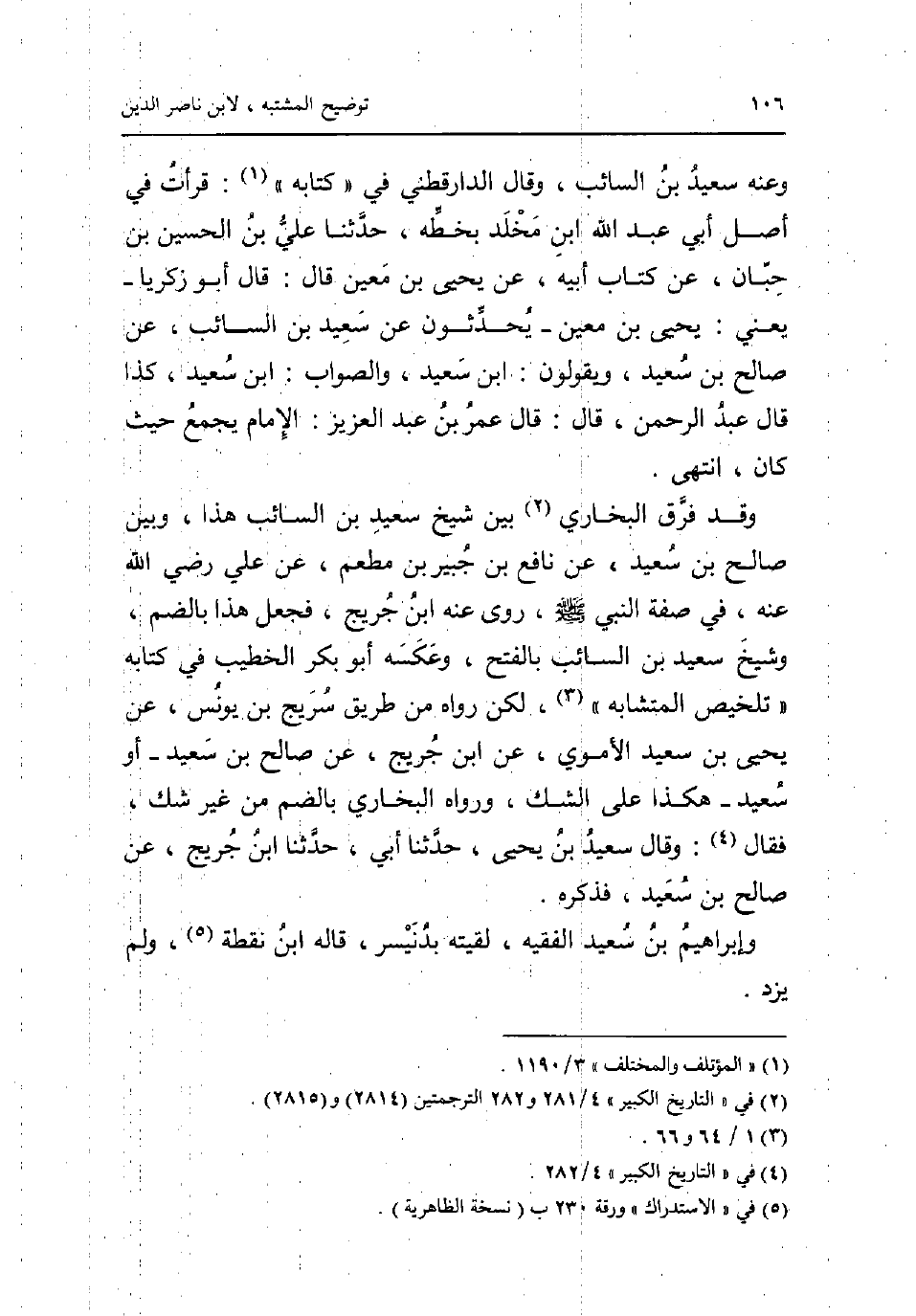 وَعنهُ سعيد بن السَّائِب وَقَالَ الدَّارَقُطْنِيّ فِي كِتَابه: قرات فِي اصل أبي عبد الله ابْن مخلد بِخَطِّهِ حَدثنَا عَليّ بن الْحُسَيْن بن حبَان عَن كتاب ابيه عَن يحيى بن معِين قَالَ: قَالَ أَبُو زَكَرِيَّا - يَعْنِي: يحيى بن معِين - يحدثُونَ عَن سعيد بن السَّائِب عَن صَالح بن سعيد وَيَقُولُونَ: ابْن سعيد وَالصَّوَاب: ابْن سعيد كَذَا قَالَ عبد الرَّحْمَن قَالَ: قَالَ عمر بن عبد الْعَزِيز: الإِمَام يجمع حَيْثُ كَانَ انْتهى. وَقد فرق البُخَارِيّ بَين شيخ سعيد بني السَّائِب هَذَا وَبَين صَالح بن سعيد عَن نَافِع بن جُبَير بن مطعم عَن عَليّ رَضِي الله عَنهُ فِي صفة النَّبِي صلى الله عَلَيْهِ وَسلم روى عَنهُ ابْن جريج فَجعل هَذَا بِالضَّمِّ وَشَيخ سعيد بن السَّائِب بِالْفَتْح وَعَكسه أَبُو بكر الْخَطِيب فِي كِتَابه تَلْخِيص الْمُتَشَابه لَكِن رَوَاهُ من طَرِيق سُرَيج بن يُونُس عَن يحيى بن سعيد الاموي عَن ابْن جريج عَن صَالح بن سعيد - أَو سعيد - هَكَذَا على الشَّك وَرَوَاهُ البُخَارِيّ بِالضَّمِّ من غير شكّ فَقَالَ: وَقَالَ سعيد بن يحيى حَدثنَا أبي حَدثنَا ابْن جريج عَن صَالح بن سعيد فَذكره. وابراهيم بن سعيد الْفَقِيه لَقيته بدنيسر قَالَه ابْن نقطة وَلم يزدْ.