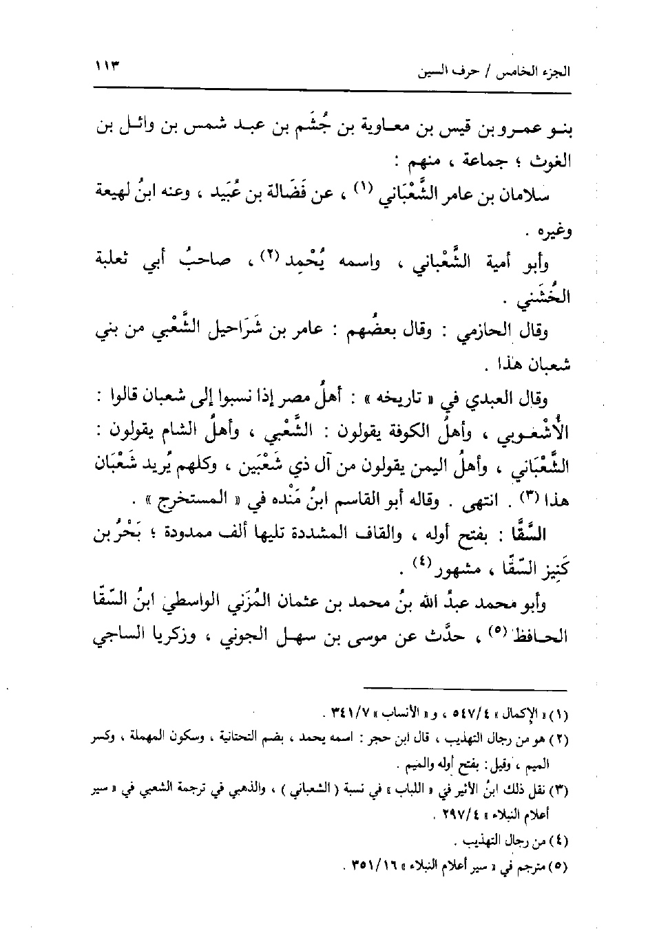 بَنو عَمْرو بن قيس بن مُعَاوِيَة بن جشم بن عبد شمس بن وَائِل بن الْغَوْث جمَاعَة مِنْهُم: سلامان بن عَامر الشَّعْبَانِي عَن فضَالة بن عبيد وَعنهُ ابْن لَهِيعَة وَغَيره. وَأَبُو أُميَّة الشَّعْبَانِي واسْمه يحمد صَاحب أبي ثَعْلَبَة الْخُشَنِي. وَقَالَ الْحَازِمِي: وَقَالَ بَعضهم: عَامر بن شرَاحِيل الشّعبِيّ من بني شعْبَان هَذَا. وَقَالَ الْعَبْدي فِي تَارِيخه: أهل مصر إِذا نسبوا إِلَى شعْبَان قَالُوا: الاشعوبي واهل الْكُوفَة يَقُولُونَ: الشّعبِيّ واهل الشَّام يَقُولُونَ: الشَّعْبَانِي واهل الْيمن يَقُولُونَ من آل ذِي شعبين وَكلهمْ يُرِيد شعْبَان هَذَا. انْتهى. وَقَالَهُ أَبُو الْقَاسِم ابْن مَنْدَه فِي الْمُسْتَخْرج. السقا: بِفَتْح اوله وَالْقَاف الْمُشَدّدَة تَلِيهَا الف ممدودة بَحر بن كنيز السقا مَشْهُور. وَأَبُو مُحَمَّد عبد الله بن مُحَمَّد بن عُثْمَان الْمُزنِيّ الوَاسِطِيّ ابْن السقا الْحَافِظ حدث عَن مُوسَى بن سهل الْجونِي وزَكَرِيا السَّاجِي