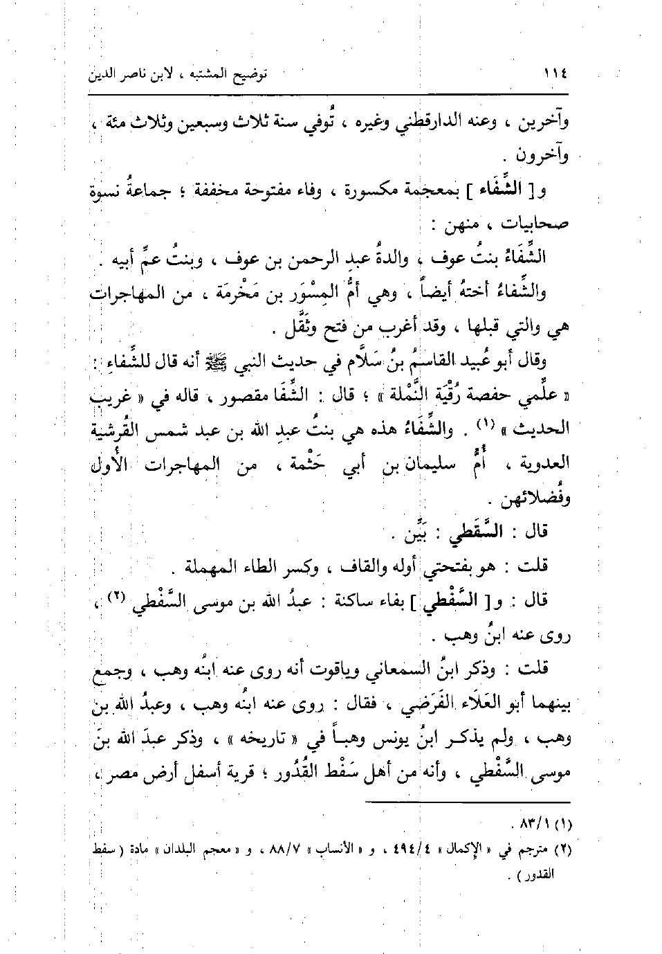 وَآخَرُونَ وَعنهُ الدَّارَقُطْنِيّ وَغَيره توفّي سنة ثَلَاث وَسبعين وَثَلَاث مئة وَآخَرُونَ. و [الشِّفَاء] بِمُعْجَمَة مَكْسُورَة وَفَاء مفتوحه مُخَفّفَة جمَاعَة نسْوَة صحابيات مِنْهُنَّ: الشِّفَاء بنت عَوْف وَالِدَة عبد الرَّحْمَن بن عَوْف وَبنت عَم أَبِيه. والشفاء أُخْته ايضا وَهِي أم الْمسور بن مخرمَة من الْمُهَاجِرَات هِيَ وَالَّتِي قبلهَا وَقد اغرب من فتح وَثقل. وَقَالَ أَبُو عبيد الْقَاسِم بن سَلام فِي حَدِيث النَّبِي صلى الله عَلَيْهِ وَسلم انه قَالَ للشفاء: علمي حَفْصَة رقية النملة قَالَ: الشفا مَقْصُور قَالَه فِي غَرِيب الحَدِيث. والشفاء هَذِه هِيَ بنت عبد الله بن عبد شمس القرشية العدوية أم سُلَيْمَان بن أبي حثْمَة من الْمُهَاجِرَات الأول وفضلائهن. قَالَ: السَّقطِي: بَين. قلت هُوَ بفتحتي أَوله وَالْقَاف وَكسر الطَّاء الْمُهْملَة قَالَ: و [السفطي] بفاء سَاكِنة: عبد الله بن مُوسَى السفطي. روى عَنهُ ابْن وهب. قلت: وَذكر ابْن السَّمْعَانِيّ وَيَاقُوت انه روى عَنهُ ابْنه وهب وَجمع بَينهمَا أَبُو الْعَلَاء الفرضي فَقَالَ: روى عَنهُ ابْنه وهب وَعبد الله بن وهب وَلم يذكر ابْن يُونُس وهبا فِي تَارِيخه وَذكر عبد الله بن مُوسَى السفطي وانه من أهل سفط الْقُدُور قَرْيَة اسفل أَرض مصر