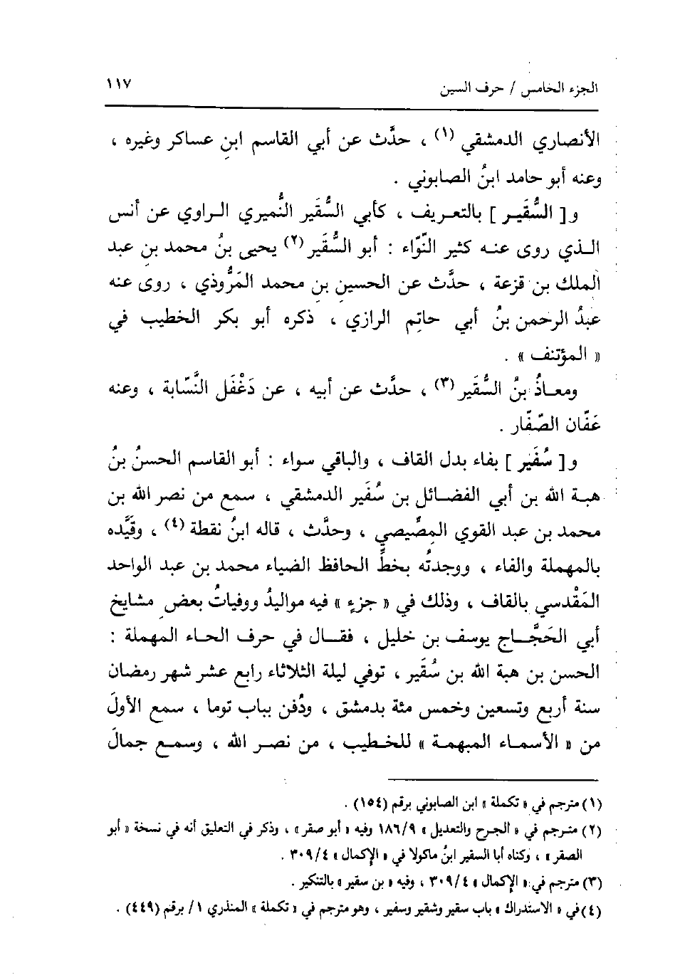 الْأنْصَارِيّ الدِّمَشْقِي حدث عَن أبي الْقَاسِم ابْن عَسَاكِر وَغَيره وَعنهُ أَبُو حَامِد ابْن الصَّابُونِي. و [السقير] بالتعريف كَأبي السقير النميري الرَّاوِي عَن أنس الَّذِي روى عَنهُ كثير النواء: أَبُو السقير يحيى بن مُحَمَّد بن عبد الْملك بن قزعة حدث عَن الْحُسَيْن بن مُحَمَّد الْمَرْوذِيّ روى عَنهُ عبد الرَّحْمَن بن أبي حَاتِم الرَّازِيّ ذكره أَبُو بكر الْخَطِيب فِي المؤتنف. ومعاذ بن السقير حدث عَن ابيه عَن دَغْفَل النسابة وَعنهُ عَفَّان الصفار. و [سفير] بفاء بدل الْقَاف وَالْبَاقِي سَوَاء: أَبُو الْقَاسِم الْحسن بن هبة الله بن أبي الْفَضَائِل بن سفير الدِّمَشْقِي سمع من نصر الله بن مُحَمَّد بن عبد الْقوي المصِّيصِي وَحدث قَالَه ابْن نقطة وَقَيده بِالْمُهْمَلَةِ وَالْفَاء وَوَجَدته بِخَط الْحَافِظ الضياء مُحَمَّد بن عبد الْوَاحِد الْمَقْدِسِي بِالْقَافِ وَذَلِكَ فِي جُزْء فِيهِ مواليد ووفيات بعض مَشَايِخ أبي الْحجَّاج يُوسُف بن خَلِيل فَقَالَ فِي حرف الْحَاء الْمُهْملَة: الْحسن بن هبة الله بن سقير توفّي لَيْلَة الثُّلَاثَاء رَابِع عشر شهر رَمَضَان سنة أَربع وَتِسْعين وَخمْس مئة بِدِمَشْق وَدفن بِبَاب توما سمع الأول من الْأَسْمَاء المبهمة للخطيب من نصر الله وَسمع جمال