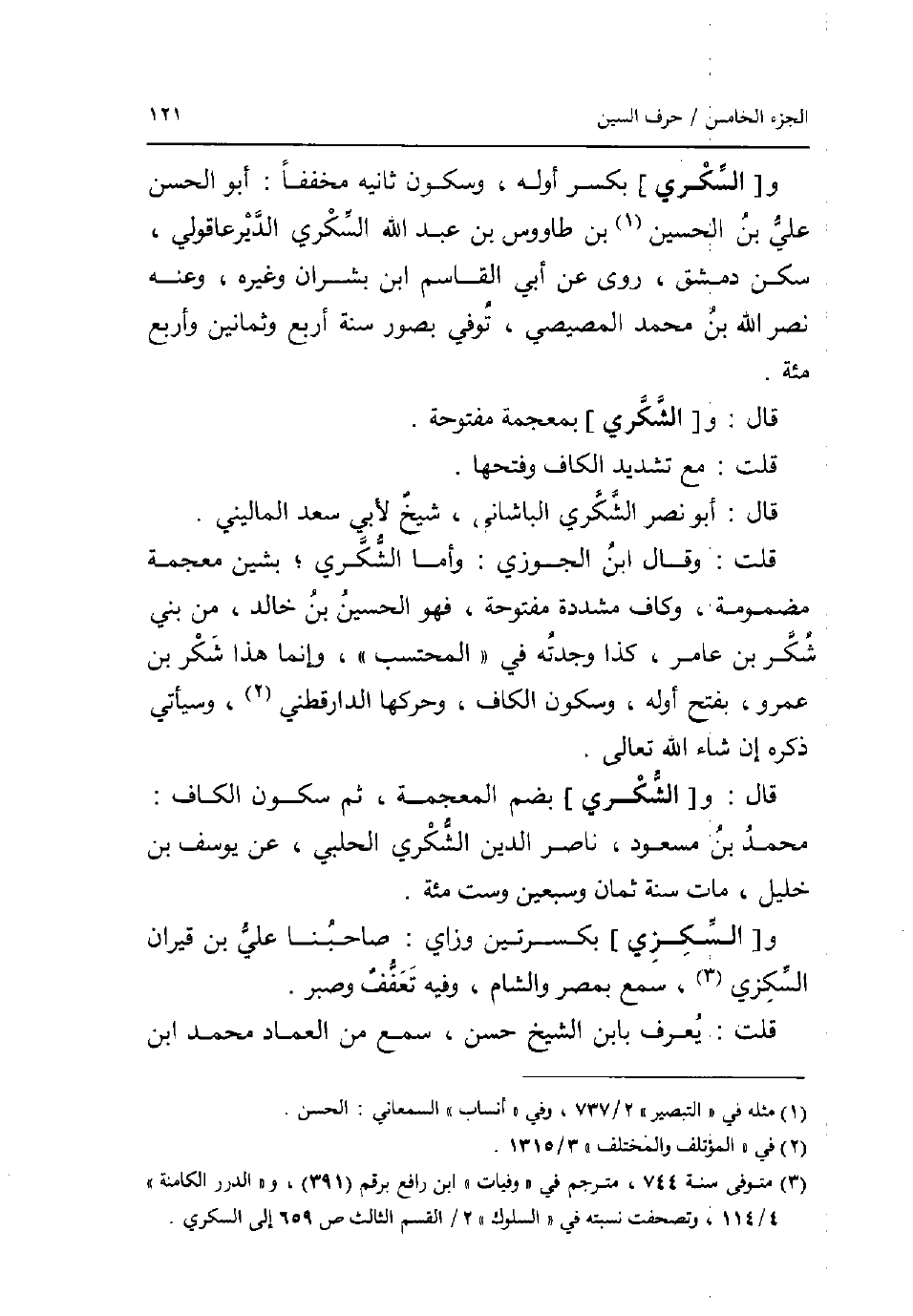 و [السكرِي] بِكَسْر أَوله وَسُكُون ثَانِيَة مخففا: أَبُو الْحسن عَليّ بن الْحُسَيْن بن طَاوُوس بن عبد الله السكرِي الديرعاقولي سكن دمشق روى عَن أبي الْقَاسِم ابْن بَشرَان وَغَيره وَعنهُ نصر الله بن مُحَمَّد المصِّيصِي توفّي بصور سنة أَربع وَثَمَانِينَ وَأَرْبع مئة. قَالَ: و [الشكري] بِمُعْجَمَة مَفْتُوحَة. قلت: مَعَ تَشْدِيد الْكَاف وَفتحهَا. قَالَ: أَبُو نصر الشكري الباشاني شيخ لابي سعد الْمَالِينِي. قلت: وَقَالَ ابْن الْجَوْزِيّ: وَأما الشكري بشين مُعْجمَة مَضْمُومَة وكاف مُشَدّدَة مَفْتُوحَة فَهُوَ الْحُسَيْن بن خَالِد من بني شكر بن عَامر كَذَا وجدته فِي الْمُحْتَسب وَإِنَّمَا هَذَا شكر بن عَمْرو بِفَتْح اوله وَسُكُون الْكَاف وحركها الدَّارَقُطْنِيّ وسياتي ذكره إِن شَاءَ الله تَعَالَى. قَالَ: و [الشكري] بِضَم الْمُعْجَمَة ثمَّ سُكُون الْكَاف: مُحَمَّد بن مَسْعُود نَاصِر الدّين الشكري الْحلَبِي عَن يُوسُف بن خَلِيل مَاتَ سنة ثَمَان وَسبعين وست مئة. و [السكزي] بكسرتين وزاي: صاحبنا عَليّ بن قيران السكزي سمع بِمصْر وَالشَّام وَفِيه تعفف وصبر. قلت: يعرف بِابْن الشَّيْخ حسن سمع من الْعِمَاد مُحَمَّد ابْن