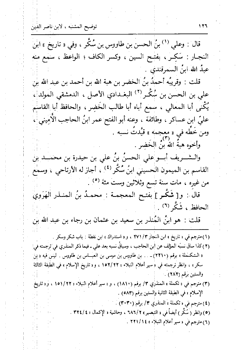 قَالَ: وَعلي بن الْحسن بن طَاوُوس بن سكر وَفِي تَارِيخ ابْن النجار: سكر بِفَتْح السِّين وَكسر الْكَاف الْوَاعِظ سمع مِنْهُ عبد الله ابْن السَّمرقَنْدِي. قلت: وقريبه أَحْمد بن الْخضر بن هبة الله بن أَحْمد بن عبد الله بن عَليّ بن الْحسن بن سكر الْبَغْدَادِيّ الاصل الدِّمَشْقِي المولد يكنى أَبَا الْمَعَالِي سمع اباه أَبَا طَالب الْخضر والحافظ أَبَا الْقَاسِم عَليّ ابْن عَسَاكِر وَطَائِفَة وَعنهُ أَبُو الْفَتْح عمر ابْن الْحَاجِب الأميني وَمن خطه فِي مُعْجَمه قيدت نسبه. وَأَخُوهُ هبة الله بن الْخضر. والشريف أَبُو عَليّ الْحسن بن عَليّ بن حيدرة بن مُحَمَّد بن الْقَاسِم بن الميمون الْحُسَيْنِي ابْن سكر أجَاز لَهُ الارتاحي وَسمع من غَيره مَاتَ سنة تسع وَثَلَاثِينَ وست مئة. قَالَ: و [شكر] بِفَتْح الْمُعْجَمَة: مُحَمَّد بن الْمُنْذر الْهَرَوِيّ الْحَافِظ شكر. قلت: هُوَ ابْن الْمُنْذر بن سعيد بن عُثْمَان بن رَجَاء بن عبد الله بن