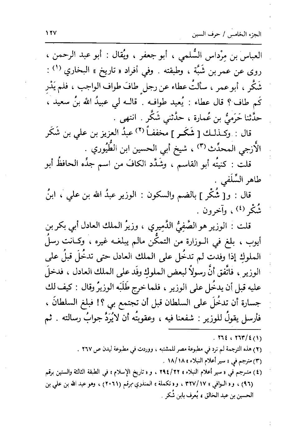 الْعَبَّاس بن مرداس السّلمِيّ أَبُو جَعْفَر وَيُقَال: أَبُو عبد الرَّحْمَن روى عَن عمر بن شبة وطبقته. وَفِي أَفْرَاد تَارِيخ البُخَارِيّ: شكر أَبُو عمر سَالَتْ عَطاء عَن رجل طَاف طواف الْوَاجِب فَلم يدر كم طَاف؟ قَالَ عَطاء: يُعِيد طَوَافه. قَالَه لي عبيد الله بن سعيد حَدثنَا حرمي بن عمَارَة حَدثنِي شكر. انْتهى. قَالَ: وَكَذَلِكَ [شكر] مخففا عبد الْعَزِيز بن عَليّ بن شكر الازجي الْمُحدث شيخ أبي الْحُسَيْن ابْن الطيوري. قلت: كنيته أَبُو الْقَاسِم وشدد الْكَاف من اسْم جده الْحَافِظ أَبُو طَاهِر السلَفِي. قَالَ: و [شكر] بِالضَّمِّ والسكون: الْوَزير عبد الله بن عَليّ ابْن شكر وَآخَرُونَ. قلت: الْوَزير هُوَ الصفي الدَّمِيرِيّ وَزِير الْملك الْعَادِل أبي بكر بن أَيُّوب بلغ فِي الوزارة من التَّمَكُّن مَا لم يبلغهُ غَيره وَكَانَت رسل الْمُلُوك إِذا وفدت لم تدخل على الْملك الْعَادِل حَتَّى تدخل قبل على الْوَزير فاتفق أَن رَسُولا لبَعض الْمُلُوك وَفد على الْملك الْعَادِل فَدخل عَلَيْهِ قبل أَن يدْخل على الْوَزير فَلَمَّا خرج طلبه الْوَزير وَقَالَ: كَيفَ لَك جسارة أَن تدخل على السُّلْطَان قبل أَن تَجْتَمِع بِي؟ ! فَبلغ السُّلْطَان فَأرْسل يَقُول للوزير: شفعنا فِيهِ وعقوبته أَن لَا يرد جَوَاب رسَالَته. ثمَّ