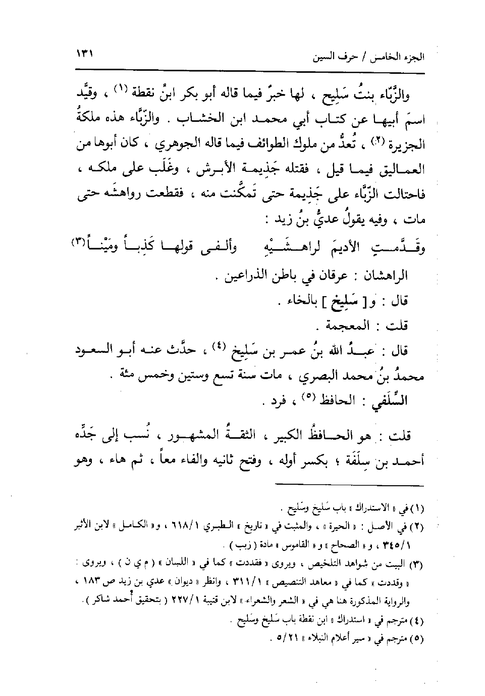 الراهشان: عرقان فِي بَاطِن الذراعين. قَالَ: و [سليخ] بِالْخَاءِ. قلت: الْمُعْجَمَة. قَالَ: عبد الله بن عمر بن سليخ حدث عَنهُ أَبُو السُّعُود مُحَمَّد بن مُحَمَّد الْبَصْرِيّ مَاتَ سنة تسع وَسِتِّينَ وَخمْس مئة. السلَفِي: الْحَافِظ فَرد. قلت: هُوَ الْحَافِظ الْكَبِير الثِّقَة الْمَشْهُور نسب إِلَى جده أَحْمد بن سلفة بِكَسْر اوله وَفتح ثَانِيَة وَالْفَاء مَعًا ثمَّ هَاء وَهُوَ