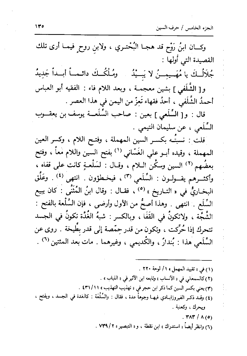 و [الشلفي] بشين مُعْجمَة وَبعد اللَّام فَاء: الْفَقِيه أَبُو الْعَبَّاس أَحْمد الشلفي أحد فُقَهَاء تعز من الْيمن فِي هَذَا الْعَصْر. قَالَ: و [السلعي] بِعَين: صَاحب السّلْعَة يُوسُف بن يَعْقُوب السلعي عَن سُلَيْمَان التَّيْمِيّ. قلت: نسبته بِكَسْر السِّين الْمُهْملَة وَفتح اللَّام وَكسر الْعين الْمُهْملَة وَقَيده أَبُو عَليّ الغساني بِفَتْح السِّين وَاللَّام مَعًا وَفتح بَعضهم السِّين وَسكن اللَّام وَقَالَ: لسلعة كَانَت على قَفاهُ واكثرهم يَقُولُونَ: السلعي فيخطؤون. انْتهى. وعلق البُخَارِيّ فِي التَّارِيخ فَقَالَ: وَقَالَ ابْن الْمثنى: كَانَ يَبِيع السّلع. انْتهى. وَهَذَا اصح من الأول وارضى فَإِن السّلْعَة بِالْفَتْح: الشَّجَّة وَلَا تكون فِي الْقَفَا وبالكسر: شبه الغدة تكون فِي الْجَسَد تتحرك إِذا حركت وَتَكون من قدر حمصة إِلَى قدر بطيخة. روى عَن السلعي هَذَا: بنْدَار والكديمي وَغَيرهمَا مَاتَ بعد المئتين.
