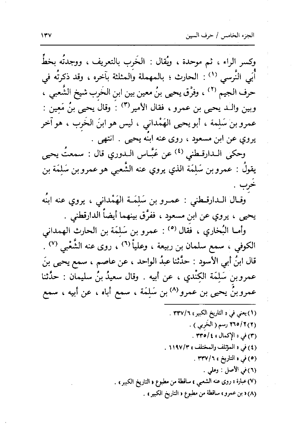 وَكسر الرَّاء ثمَّ مُوَحدَة وَيُقَال: الخرب بالتعريف وَوَجَدته بِخَط أبي النَّرْسِي: الْحَارِث بِالْمُهْمَلَةِ والمثلثة بآخرة وَقد ذكرته فِي حرف الْجِيم وَفرق يحيى بن معِين بَين ابْن الخرب شيخ الشّعبِيّ وَبَين وَالِد يحيى بن عَمْرو فَقَالَ الْأَمِير: وَقَالَ يحيى بن معِين: عَمْرو بن سَلمَة أَبُو يحيى الْهَمدَانِي لَيْسَ هُوَ ابْن الخرب هُوَ آخر يروي عَن ابْن مَسْعُود روى عَنهُ ابْنه يحيى. انْتهى. وَحكى الدَّارَقُطْنِيّ عَن عَبَّاس الدوري قَالَ: سَمِعت يحيى يَقُول: عَمْرو بن سَلمَة الَّذِي يرْوى عَنهُ الشّعبِيّ هُوَ عَمْرو بن سَلمَة بن خرب. وَقَالَ الدَّارَقُطْنِيّ: عَمْرو بن سَلمَة الْهَمدَانِي يروي عَنهُ ابْنه يحيى يروي عَن ابْن مَسْعُود فَفرق بَينهمَا أَيْضا الدَّارَقُطْنِيّ. وَأما البُخَارِيّ فَقَالَ: عَمْرو بن سَلمَة بن الْحَارِث الْهَمدَانِي الْكُوفِي سمع سلمَان بن ربيعَة وعليا روى عَنهُ الشّعبِيّ. قَالَ ابْن أبي الْأسود: حَدثنَا عبد الْوَاحِد عَن عَاصِم سمع يحيى بن عَمْرو بن سَلمَة الْكِنْدِيّ عَن أَبِيه. وَقَالَ سعيد بن سُلَيْمَان: حَدثنَا عَمْرو بن يحيى بن عَمْرو بن سَلمَة سمع اباه عَن ابيه سمع