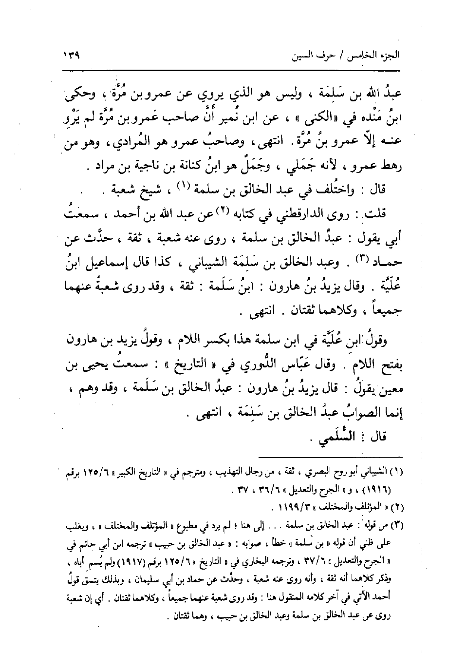 عبد الله بن سَلمَة وَلَيْسَ هُوَ الَّذِي يروي عَن عَمْرو بن مرّة وَحكى ابْن مَنْدَه فِي الكنى عَن ابْن نمير أَن صَاحب عمر بن مرّة لم يرو عَنهُ إِلَّا عَمْرو بن مرّة انْتهى وَصَاحب عَمْرو هُوَ الْمرَادِي وَهُوَ من رَهْط عَمْرو لِأَنَّهُ جملي وجمل هُوَ ابْن كنَانَة بن نَاجِية بن مُرَاد. قَالَ: وَاخْتلف فِي عبد الْخَالِق بن سَلمَة شيخ شُعْبَة. قلت: روى الدَّارَقُطْنِيّ فِي كِتَابه عَن عبد الله بن احْمَد سَمِعت أبي يَقُول: عبد الْخَالِق بن سَلمَة روى عَنهُ شُعْبَة ثِقَة حدث عَن حَمَّاد. وَعبد الْخَالِق بن سَلمَة الشَّيْبَانِيّ كَذَا قَالَ إِسْمَاعِيل ابْن علية. وَقَالَ يزِيد بن هَارُون: ابْن سَلمَة: ثِقَة وَقد روى شُعْبَة عَنْهُمَا جَمِيعًا وَكِلَاهُمَا ثقتان. انْتهى. وَقَول ابْن علية فِي ابْن سَلمَة هَذَا بِكَسْر اللَّام وَقَول يزِيد بن هَارُون بِفَتْح اللَّام. وَقَالَ عَبَّاس الدوري فِي التَّارِيخ: سَمِعت يحيى بن معِين يَقُول: قَالَ يزِيد بن هَارُون: عبد الْخَالِق بن سَلمَة وَقد وهم إِنَّمَا الصَّوَاب عبد الْخَالِق بن سَلمَة انْتهى. قَالَ: السّلمِيّ.