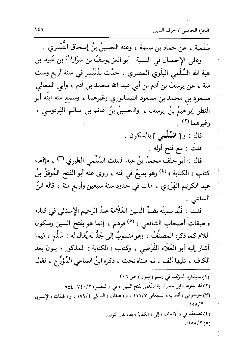 سلمية عَن حَمَّاد بن سَلمَة وَعنهُ الْحُسَيْن بن إِسْحَاق التسترِي. وعَلى الاجمال فِي النِّسْبَة: أَبُو الْعِزّ يُوسُف بن سوار بن عبيد بن هبة الله السّلمِيّ البلوي الْمصْرِيّ حدث بدنيسر فِي سنة أَربع وست مئة عَن يُوسُف بن آدم بن أبي عبد الله مُحَمَّد بن آدم وابي الْمَعَالِي مَسْعُود بن مُحَمَّد بن مَسْعُود النَّيْسَابُورِي وَغَيرهمَا وَسمع مِنْهُ ابْنه أَبُو النّظر إِبْرَاهِيم بن يُوسُف وَالْحُسَيْن بن غَانِم بن سَالم الفردوسي وَغَيرهمَا. قَالَ: و [السّلمِيّ] بِالسُّكُونِ. قلت: مَعَ فتح أَوله. قَالَ: أَبُو خلف مُحَمَّد بن عبد الْملك السّلمِيّ الطَّبَرِيّ مؤلف كتاب الْكِنَايَة وَهُوَ بديع فِي فنه روى عَنهُ أَبُو الْفَتْح الْمُوفق بن عبد الْكَرِيم الْهَرَوِيّ مَاتَ فِي حُدُود سنة سبعين وَأَرْبع مئة قَالَه ابْن السَّاعِي. قلت: قيد نسبته بضمم السِّين الْعَلامَة عبد الرَّحِيم الاسنائي فِي كِتَابه طَبَقَات أَصْحَاب الشَّافِعِي فَوَهم إِنَّمَا هُوَ بِفَتْح السِّين وَسُكُون اللَّام كَمَا ذكره المُصَنّف وَهُوَ مَنْسُوب إِلَى جد لَهُ يُقَال لَهُ: سلم فِيمَا أَشَارَ إِلَيْهِ أَبُو الْعَلَاء الفرضي وَكتاب الْكِنَايَة الْمَذْكُور بنُون بعد الْكَاف تَلِيهَا ألف ثمَّ مثناة تَحت ذكره ابْن السَّاعِي المؤرخ فَقَالَ