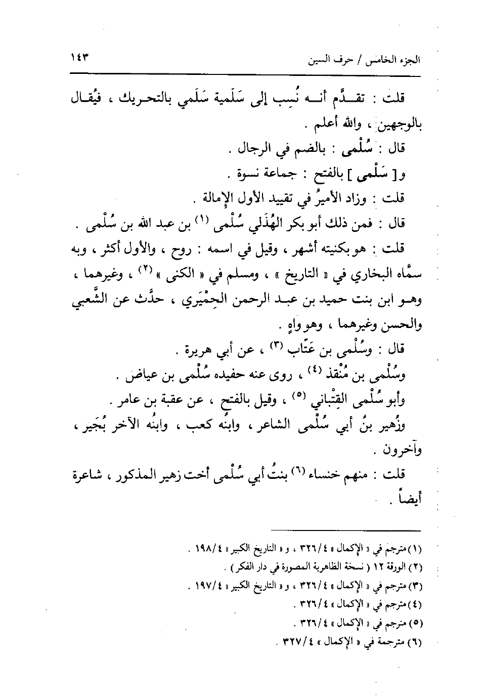 قلت: تقدم انه نسب إِلَى سلمية سلمي بِالتَّحْرِيكِ فَيُقَال بِالْوَجْهَيْنِ وَالله أعلم. قَالَ: سلمى: بِالضَّمِّ فِي الرِّجَال و. [سلمى] بِالْفَتْح: جمَاعَة نسْوَة. قلت: وَزَاد الْأَمِير فِي تَقْيِيد الأول الامالة. قَالَ: فَمن ذَلِك أَبُو بكر الْهُذلِيّ سلمى بن عبد الله بن سلمى. قلت: هُوَ بكنيته اشهر وَقيل فِي اسْمه: روح وَالْأول اكثر وَبِه سَمَّاهُ البُخَارِيّ فِي التَّارِيخ وَمُسلم فِي الكنى وَغَيرهمَا وَهُوَ ابْن بنت حميد بن عبد الرَّحْمَن الْحِمْيَرِي حدث عَن الشّعبِيّ وَالْحسن وَغَيرهمَا وَهُوَ واه. قَالَ: وسلمى بن عتاب عَن أبي هُرَيْرَة. وسلمى بن منقذ روى عَنهُ حفيده سلمى بن عِيَاض. وَأَبُو سلمى الْقِتْبَانِي وَقيل بِالْفَتْح عَن عقبَة بن عَامر. وَزُهَيْر بن أبي سلمى الشَّاعِر وَابْنه كَعْب وَابْنه الآخر بجير وَآخَرُونَ. قلت: مِنْهُم خنساء بنت أبي سلمى اخت زُهَيْر الْمَذْكُور شاعرة أَيْضا.