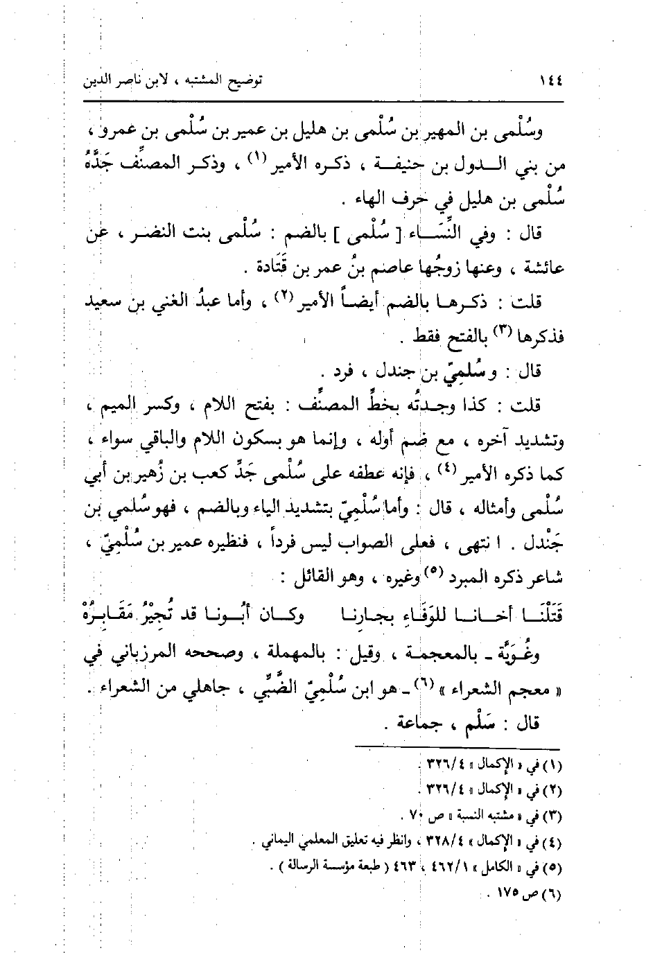 وسلمى بن المهير بن سلمى بن هليل بن عُمَيْر بن سلمى بن عَمْرو من بني الدول بن حنيفَة ذكره الامير وَذكر المُصَنّف جده سلمى بن هليل فِي حرف الْهَاء. قَالَ: وَفِي النِّسَاء [سلمى] بِالضَّمِّ: سلمى بنت النَّضر عَن عَائِشَة وعنها زَوجهَا عَاصِم بن عمر بن قَتَادَة. قلت: ذكرهَا بِالضَّمِّ أَيْضا الامير وَأما عبد الْغَنِيّ بن سعيد فَذكرهَا بِالْفَتْح فَقَط. قَالَ: وسلمي بن جندل فَرد. قلت: كَذَا وجدته بِخَط المُصَنّف: بِفَتْح اللَّام وَكسر الْمِيم وَتَشْديد آخِره مَعَ ضم اوله وانما هُوَ بِسُكُون اللَّام وَالْبَاقِي سَوَاء كَمَا ذكره الامير فَإِنَّهُ عطفه على سلمى جد كَعْب بن زُهَيْر بن أبي سلمى وامثاله قَالَ: واما سلمي بتَشْديد الْيَاء وبالضم فَهُوَ سلمي بن جندل انْتهى فعلى الصَّوَاب لَيْسَ فَردا فنظيره عُمَيْر بن سلمي شَاعِر ذكره الْمبرد وَغَيره وَهُوَ الْقَائِل: