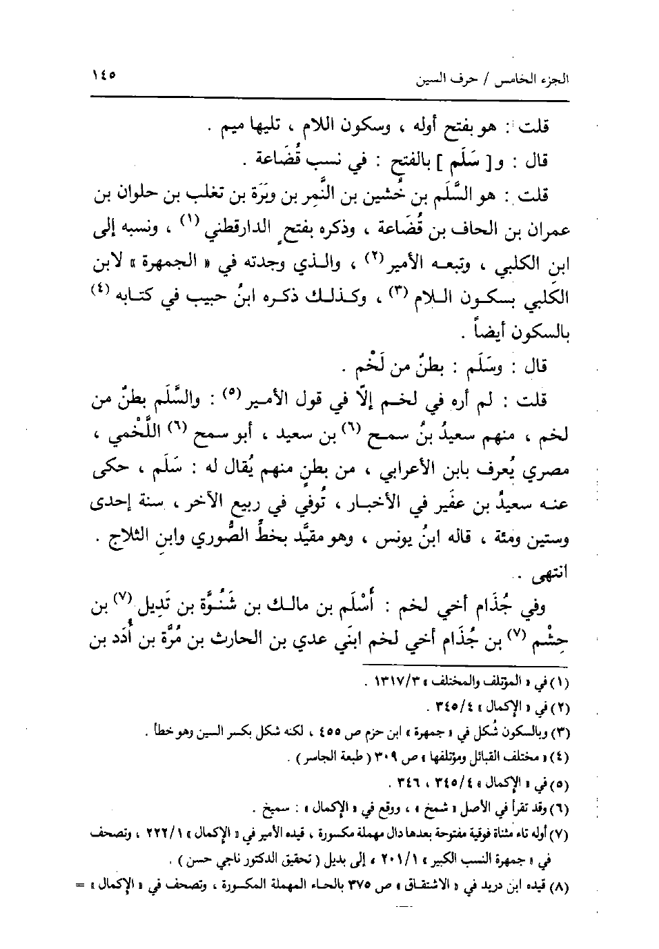 قلت: هُوَ بِفَتْح اوله وَسُكُون اللَّام تَلِيهَا مِيم. قَالَ: و [سلم] بِالْفَتْح: فِي نسب قضاعة. قلت: هُوَ السّلم بن خشين بن النمر بن وبرة بن تغلب بن حلوان بن عمرَان بن الحاف بن قضاعة وَذكره بِفَتْح الدَّارَقُطْنِيّ وَنسبه إِلَى ابْن الْكَلْبِيّ وَتَبعهُ الامير وَالَّذِي وجدته فِي الجمهرة لِابْنِ الْكَلْبِيّ بِسُكُون اللَّام وَكَذَلِكَ ذكره ابْن حبيب فِي كِتَابه بِالسُّكُونِ أَيْضا. قَالَ: وَسلم: بطن من لخم. قلت: لم أره فِي لخم إِلَّا فِي قَول الْأَمِير: وَالسّلم بطن من لخم مِنْهُم سعيد بن سمح بن سعيد أَبُو سمح اللَّخْمِيّ مصري يعرف بِابْن الاعرابي من بطن مِنْهُم يُقَال لَهُ: سلم حكى عَنهُ سعيد بن عفير فِي الاخبار توفّي فِي ربيع الآخر سنة إِحْدَى وَسِتِّينَ ومئة قَالَه ابْن يُونُس وَهُوَ مُقَيّد بِخَط الصُّورِي وَابْن الثلاج. انْتهى. وَفِي جذام أخي لخم: اسْلَمْ بن مَالك بن شنوة بن تديل بن حشم بن جذام أخي لخم ابْني عدي بن الْحَارِث بن مرّة بن ادد بن