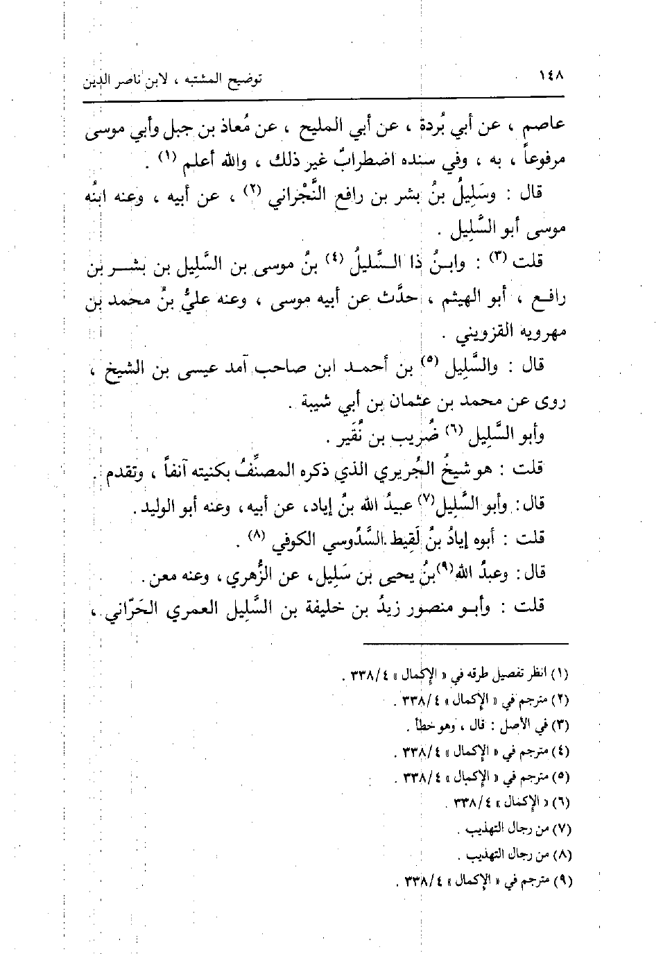 عَاصِم عَن أبي بردة عَن أبي الْمليح عَن معَاذ بن جبل وابي مُوسَى مَرْفُوعا بِهِ وَفِي سَنَده اضْطِرَاب غير ذَلِك وَالله أعلم. قَالَ: وسليل بن بشر بن رَافع النجراني عَن ابيه وَعنهُ ابْنه مُوسَى أَبُو السَّلِيل. قلت: وَابْن ذَا السَّلِيل بن مُوسَى بن السَّلِيل بن بشر بن رَافع أَبُو الْهَيْثَم حدث عَن أَبِيه مُوسَى وَعنهُ عَليّ بن مُحَمَّد بن مهرويه الْقزْوِينِي. قَالَ: والسليل بن أَحْمد ابْن صَاحب آمد عِيسَى بن الشَّيْخ روى عَن مُحَمَّد بن عُثْمَان بن أبي شيبَة. وَأَبُو السَّلِيل ضريب بن نقير. قلت: هُوَ شيخ الْجريرِي الَّذِي ذكره المُصَنّف بكنيته آنِفا وَتقدم. قَالَ: وَأَبُو السَّلِيل عبيد الله بن اياد عَن ابيه وَعنهُ أَبُو الْوَلِيد. قلت: أَبوهُ إياد بن لَقِيط السدُوسِي الْكُوفِي. قَالَ: وَعبد الله بن يحيى بن سليل عَن الزُّهْرِيّ وَعنهُ معن. قلت: وَأَبُو مَنْصُور زيد بن خَليفَة بن السَّلِيل الْعمريّ الْحَرَّانِي