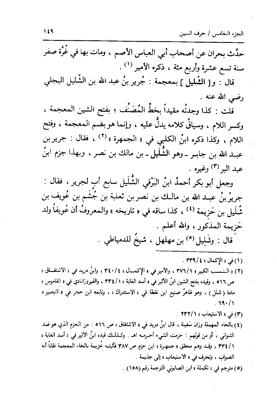 حدث بحران عَن أَصْحَاب أبي الْعَبَّاس الاصم وَمَات بهَا فِي غرَّة صفر سنة تسع عشرَة وَأَرْبع مئة ذكره الْأَمِير. قَالَ: و [الشليل] بِمُعْجَمَة: جرير بن عبد الله بن الشليل البَجلِيّ رَضِي الله عَنهُ. قلت: كَذَا وجدته مُقَيّدا بِخَط المُصَنّف بِفَتْح الشين الْمُعْجَمَة وَكسر اللَّام وَسِيَاق كَلَامه يدل عَلَيْهِ وَإِنَّمَا هُوَ بِضَم الْمُعْجَمَة وَفتح اللَّام وَكَذَا ذكره ابْن الْكَلْبِيّ فِي الجمهرة فَقَالَ: جرير بن عبد الله بن جَابر - وَهُوَ الشليل - بن مَالك بن نصر وَبِهَذَا جزم ابْن عبد الْبر وَغَيره. وَجعل أَبُو بكر أَحْمد ابْن البرقي الشليل سَابِع اب لجرير فَقَالَ: جرير بن عبد الله بن مَالك بن نصر بن ثَعْلَبَة بن جشم بن عويف بن شليل بن حزيمة كَذَا سَاقه فِي تَارِيخه وَالْمَعْرُوف أَن عويفا ولد حزيمة الْمَذْكُور وَالله اعْلَم. قَالَ: وشليل بن مهلهل شيخ للدمياطي.