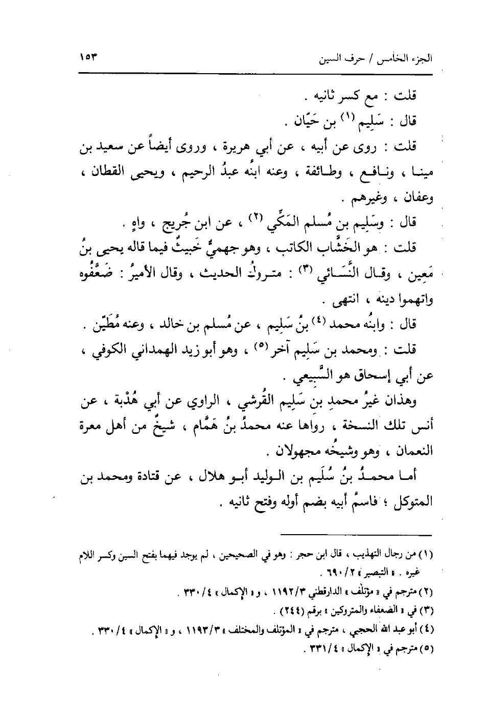 قلت: مَعَ كسر ثَانِيَة. قَالَ: سليم بن حَيَّان. قلت: روى عَن ابيه عَن أبي هُرَيْرَة وروى أَيْضا عَن سعيد بن مينا وَنَافِع وَطَائِفَة وَعنهُ ابْنه عبد الرَّحِيم وَيحيى الْقطَّان وَعَفَّان وَغَيرهم. قَالَ: وسليم بن مُسلم الْمَكِّيّ عَن ابْن جريج واه. قلت: هُوَ الخشاب الْكَاتِب وَهُوَ جهمي خَبِيث فِيمَا قَالَه يحيى بن معِين وَقَالَ النَّسَائِيّ: مَتْرُوك الحَدِيث وَقَالَ الْأَمِير: ضَعَّفُوهُ واتهموا دينه انْتهى. قَالَ: وَابْنه مُحَمَّد بن سليم عَن مُسلم بن خَالِد وَعنهُ مطين قلت وَمُحَمّد بن سليم آخر وَهُوَ أَبُو زيد الْهَمدَانِي الْكُوفِي عَن أبي إِسْحَاق هُوَ السبيعِي. وَهَذَانِ غير مُحَمَّد بن سليم الْقرشِي الرَّاوِي عَن أبي هدبة عَن أنس تِلْكَ النُّسْخَة رَوَاهَا عَنهُ مُحَمَّد بن همام شيخ من أهل معرة. النُّعْمَان وَهُوَ وَشَيْخه مَجْهُولَانِ. أما مُحَمَّد بن سليم بن الْوَلِيد أَبُو هِلَال عَن قَتَادَة وَمُحَمّد بن المتَوَكل فاسم أَبِيه بِضَم أَوله وَفتح ثَانِيه.