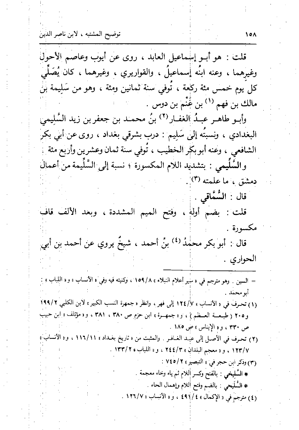 قلت: هُوَ أَبُو إِسْمَاعِيل العابد روى عَن أَيُّوب وَعَاصِم الاحول وَغَيرهمَا وَعنهُ ابْنه اسماعيل والقواريري وَغَيرهمَا كَانَ يُصَلِّي كل يَوْم خمس مئة رَكْعَة توفّي سنة ثَمَانِينَ ومئة وَهُوَ من سليمَة بن مَالك بن فهم بن غنم بن دوس. وَأَبُو طَاهِر عبد الْغفار بن مُحَمَّد بن جَعْفَر بن زيد السليمي الْبَغْدَادِيّ ونسبته إِلَى سليم: درب بشرقي بَغْدَاد روى عَن أبي بكر الشَّافِعِي وَعنهُ أَبُو بكر الْخَطِيب توفّي سنة ثَمَان وَعشْرين وَأَرْبع مئة. والسليمي: بتَشْديد اللَّام الْمَكْسُورَة نِسْبَة إِلَى السليمة من أَعمال دمشق مَا عَلمته. قَالَ: السماقي. قلت: بِضَم أَوله وَفتح الْمِيم الْمُشَدّدَة وَبعد الْألف قَاف مَكْسُورَة. قَالَ: أَبُو بكر مُحَمَّد بن احْمَد شيخ يروي عَن أَحْمد بن أبي الْحوَاري.