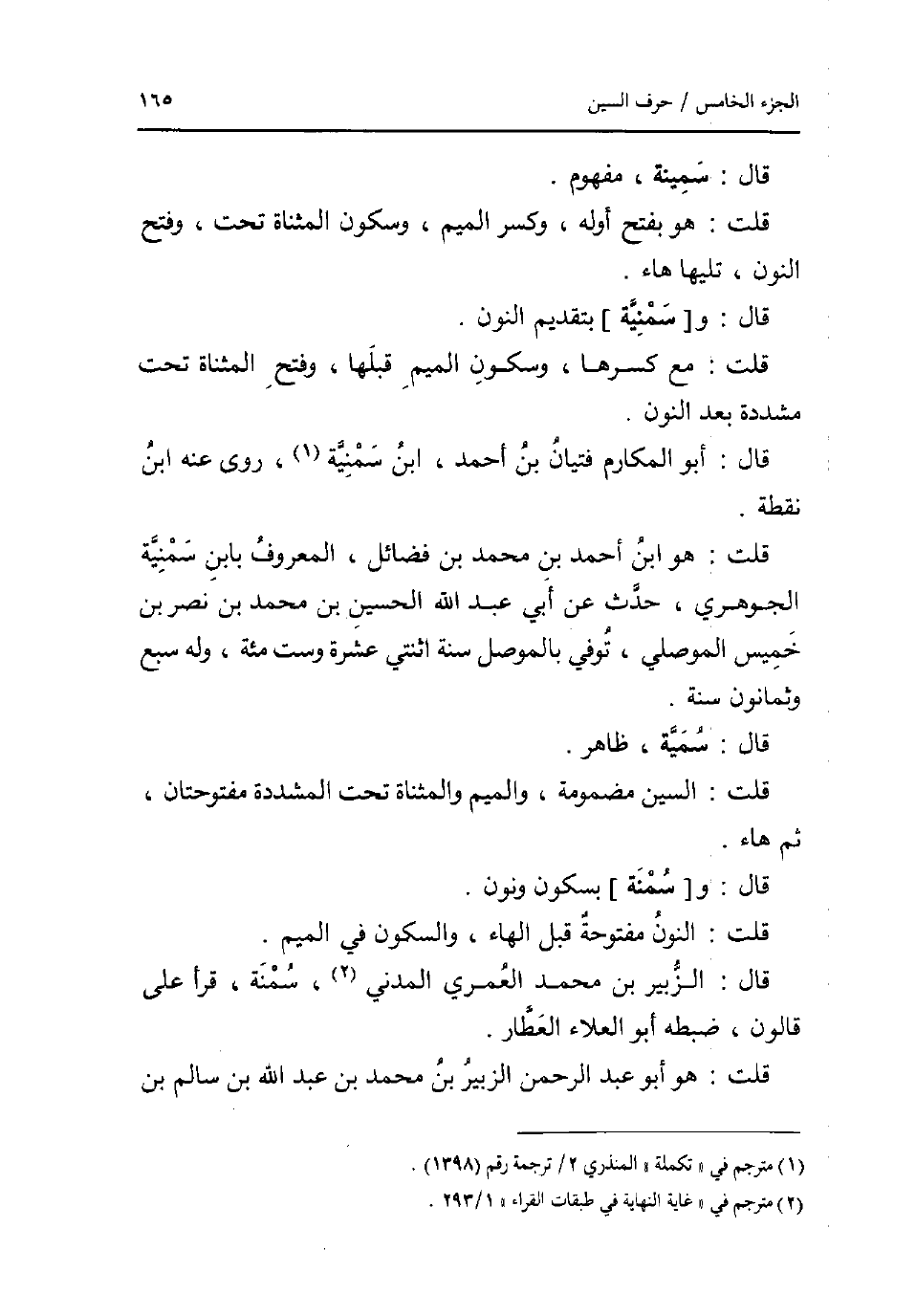 قَالَ: سَمِينَة مَفْهُوم. قلت: هُوَ بِفَتْح اوله وَكسر الْمِيم وَسُكُون الْمُثَنَّاة تَحت وَفتح النُّون تَلِيهَا هَاء. قَالَ: و [سمنية] بِتَقْدِيم النُّون. قلت: مَعَ كسرهَا وَسُكُون الْمِيم قبلهَا وَفتح الْمُثَنَّاة تَحت مُشَدّدَة بعد النُّون. قَالَ: أَبُو المكارم فتيَان بن أَحْمد ابْن سمنية روى عَنهُ ابْن نقطة. قلت: هُوَ ابْن أَحْمد بن مُحَمَّد بن فَضَائِل الْمَعْرُوف بِابْن سمنية الْجَوْهَرِي حدث عَن أبي عبد الله الْحُسَيْن بن مُحَمَّد بن نصر بن خَمِيس الْموصِلِي توفّي بالموصل سنة اثْنَتَيْ عشرَة وست مئة وَله سبع وَثَمَانُونَ سنة. قَالَ: سميَّة ظَاهر قلت: السِّين مَضْمُومَة وَالْمِيم والمثناة تَحت الْمُشَدّدَة مفتوحتان ثمَّ هَاء. قَالَ: و [سمنة] بِسُكُون وَنون. قلت: النُّون مَفْتُوحَة قبل الْهَاء والسكون فِي الْمِيم. قَالَ: الزبير بن مُحَمَّد الْعمريّ الْمدنِي سمنة قَرَأَ على قالون ضَبطه أَبُو الْعَلَاء الْعَطَّار. قلت: هُوَ أَبُو عبد الرَّحْمَن الزبير بن مُحَمَّد بن عبد الله بن سَالم بن