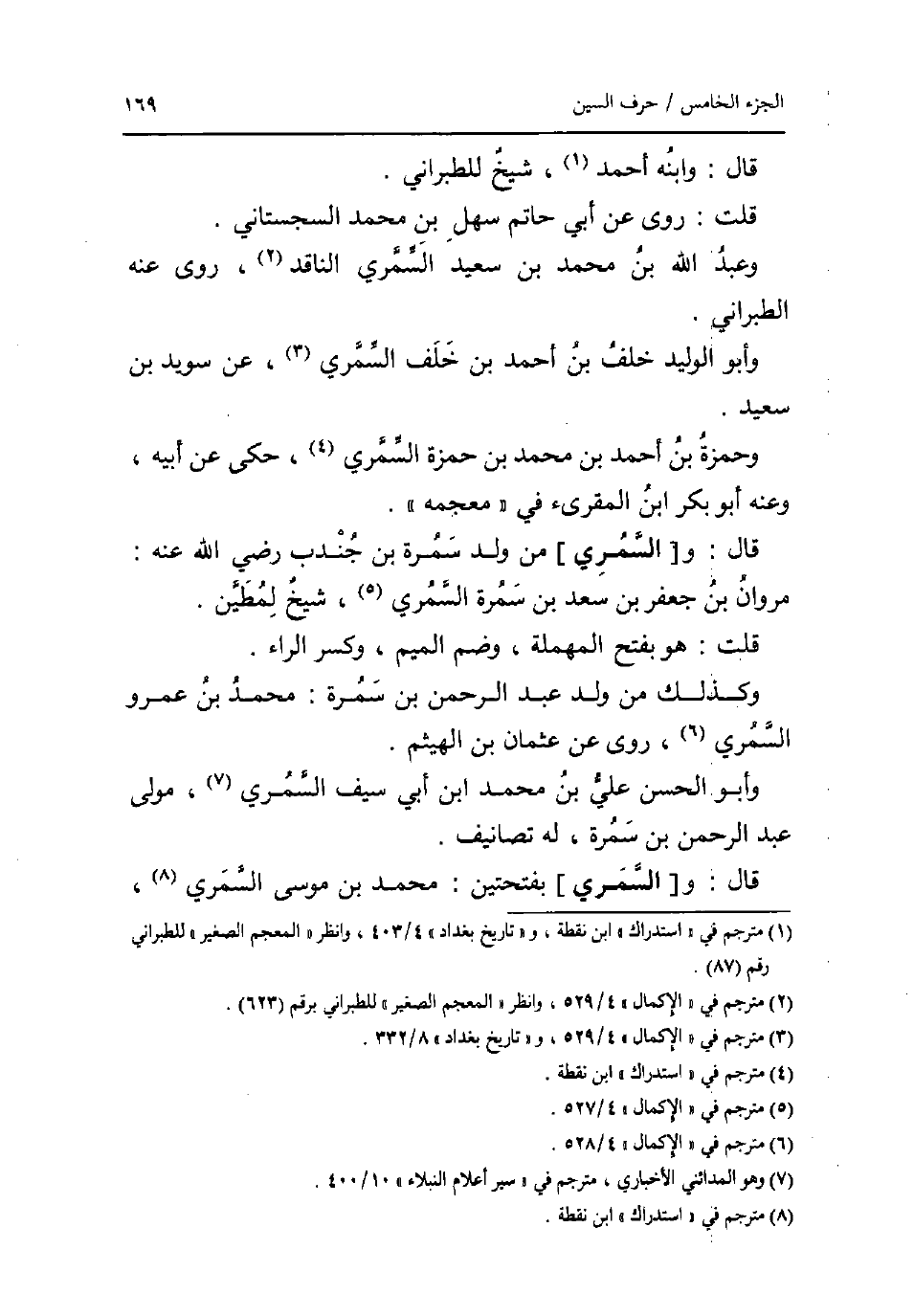 قَالَ: وَابْنه احْمَد شيخ للطبراني. قلت: روى عَن أبي حَاتِم سهل بن مُحَمَّد السجسْتانِي. وَعبد الله بن مُحَمَّد بن سعيد السمري النَّاقِد روى عَنهُ الطَّبَرَانِيّ. وَأَبُو الْوَلِيد خلف بن أَحْمد بن خلف السمري عَن سُوَيْد بن سعيد. وَحَمْزَة بن أَحْمد بن مُحَمَّد بن حَمْزَة السمري حكى عَن أَبِيه وَعنهُ أَبُو بكر ابْن الْمُقْرِئ فِي مُعْجَمه. قَالَ: و [السمري] من ولد سَمُرَة بن جُنْدُب رَضِي الله عَنهُ: مَرْوَان بن جَعْفَر بن سعد بن سَمُرَة السمري شيخ لمطين. قلت: هُوَ بِفَتْح الْمُهْملَة وَضم الْمِيم وَكسر الرَّاء. وَكَذَلِكَ من ولد عبد الرَّحْمَن بن سَمُرَة: مُحَمَّد بن عَمْرو السمري روى عَن عُثْمَان بن الْهَيْثَم. وَأَبُو الْحسن عَليّ بن مُحَمَّد ابْن أبي سيف السمري مولى عبد الرَّحْمَن بن سَمُرَة لَهُ تصانيف. قَالَ: و [السمري] بِفتْحَتَيْنِ: مُحَمَّد بن مُوسَى السمري