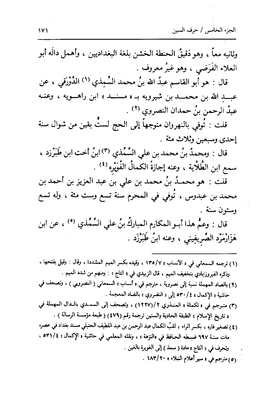 وثانيه مَعًا وَهُوَ دَقِيق الْحِنْطَة الخشن بلغَة البغداديين واهمل داله أَبُو الْعَلَاء الفرضي وَهُوَ غير مَعْرُوف. قَالَ: هُوَ أَبُو الْقَاسِم عبد الله بن مُحَمَّد السمذي الدَّوْرَقِي عَن عبد الله بن مُحَمَّد بن شيرويه ب مُسْند ابْن رَاهَوَيْه وَعنهُ عبد الرَّحْمَن بن حمدَان النصروي. قلت: توفّي بالنهروان مُتَوَجها إِلَى الْحَج لست بَقينَ من شَوَّال سنة إِحْدَى وَسبعين وَثَلَاث مئة. قَالَ: وَمُحَمّد بن مُحَمَّد بن عَليّ السمذي ابْن اخت ابْن طبرزد سمع ابْن الطلاية وَعنهُ إجَازَة الْكَمَال الفويره. قلت: هُوَ مُحَمَّد بن مُحَمَّد بن عَليّ بن عبد الْعَزِيز بن أَحْمد بن مُحَمَّد بن عَبدُوس توفّي فِي الْمحرم سنة تسع وست مئة وَله تسع وَسِتُّونَ سنة. قَالَ: وَعم هَذَا أَبُو المكارم الْمُبَارك بن عَليّ السمذي عَن ابْن هزارمرد الصريفيني وَعنهُ ابْن طبرزد.