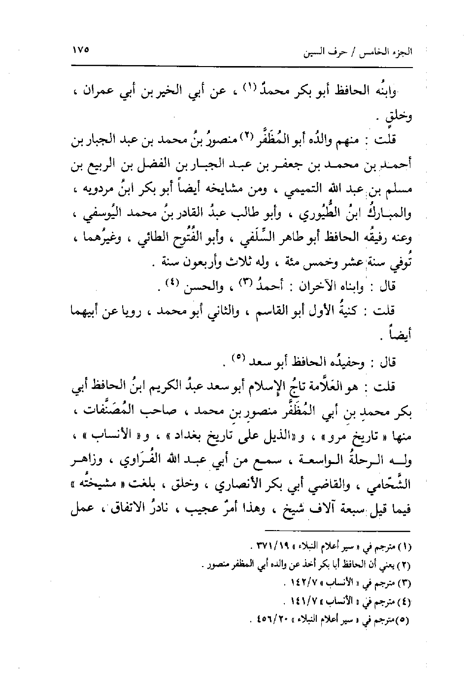 وَابْنه الْحَافِظ أَبُو بكر مُحَمَّد عَن أبي الْخَيْر بن أبي عمرَان وَخلق. قلت: مِنْهُم وَالِده أَبُو المظفر مَنْصُور بن مُحَمَّد بن عبد الْجَبَّار بن أَحْمد بن مُحَمَّد بن جَعْفَر بن عبد الْجَبَّار بن الْفضل بن الرّبيع بن مُسلم بن عبد الله التَّمِيمِي وَمن مشايخه أَيْضا أَبُو بكر ابْن مرْدَوَيْه وَالْمبَارك ابْن الطيوري وَأَبُو طَالب عبد الْقَادِر بن مُحَمَّد اليوسفي وَعنهُ رَفِيقَة الْحَافِظ أَبُو طَاهِر السلَفِي وَأَبُو الْفتُوح الطَّائِي وَغَيرهمَا توفّي سنة عشر وَخمْس مئة وَله ثَلَاث واربعون سنة. قَالَ: وابناه الاخران: احْمَد وَالْحسن. قلت: كنية الأول أَبُو الْقَاسِم وَالثَّانِي أَبُو مُحَمَّد رويا عَن ابيهما أَيْضا. قَالَ: وحفيده الْحَافِظ أَبُو سعد. قلت: هُوَ الْعَلامَة تَاج الْإِسْلَام أَبُو سعد عبد الْكَرِيم ابْن الْحَافِظ أبي بكر مُحَمَّد بن أبي المظفر مَنْصُور بن مُحَمَّد صَاحب المصنفات مِنْهَا تَارِيخ مرو والذيل على تَارِيخ بَغْدَاد والانساب وَله الرحلة الواسعة سمع من أبي عبد الله الفراوي وزاهر الشحامي وَالْقَاضِي أبي بكر الْأنْصَارِيّ وَخلق بلغت مشيخته فِيمَا قيل سَبْعَة آلَاف شيخ وَهَذَا أَمر عَجِيب نَادِر الِاتِّفَاق عمل