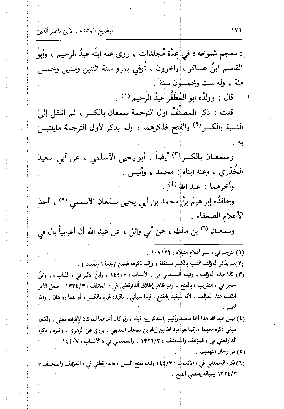 مُعْجم شُيُوخه فِي عدَّة مجلدات روى عَنهُ ابْنه عبد الرَّحِيم وَأَبُو الْقَاسِم ابْن عَسَاكِر وَآخَرُونَ توفّي بمرو سنة اثْنَتَيْنِ وَسِتِّينَ وَخمْس مئة وَله سِتّ وَخَمْسُونَ سنة. قَالَ وَولده أَبُو المظفر عبد الرَّحِيم قلت: ذكر المُصَنّف أول التَّرْجَمَة سمْعَان بِالْكَسْرِ ثمَّ انْتقل إِلَى النِّسْبَة بِالْكَسْرِ وَالْفَتْح فذكرهما وَلم يذكر لأوّل التَّرْجَمَة مَا يلتبس بِهِ. وسمعان بِالْكَسْرِ أَيْضا: أَبُو يحيى الاسلمي عَن أبي سعيد الْخُدْرِيّ وَعنهُ ابناه: مُحَمَّد وانيس. واخوهما: عبد الله. وحافدة إِبْرَاهِيم بن مُحَمَّد بن أبي يحيى سمْعَان الاسلمي أحد الاعلام الضُّعَفَاء. وسمعان بن مَالك عَن أبي وَائِل عَن عبد الله أَن اعرابيا بَال فِي