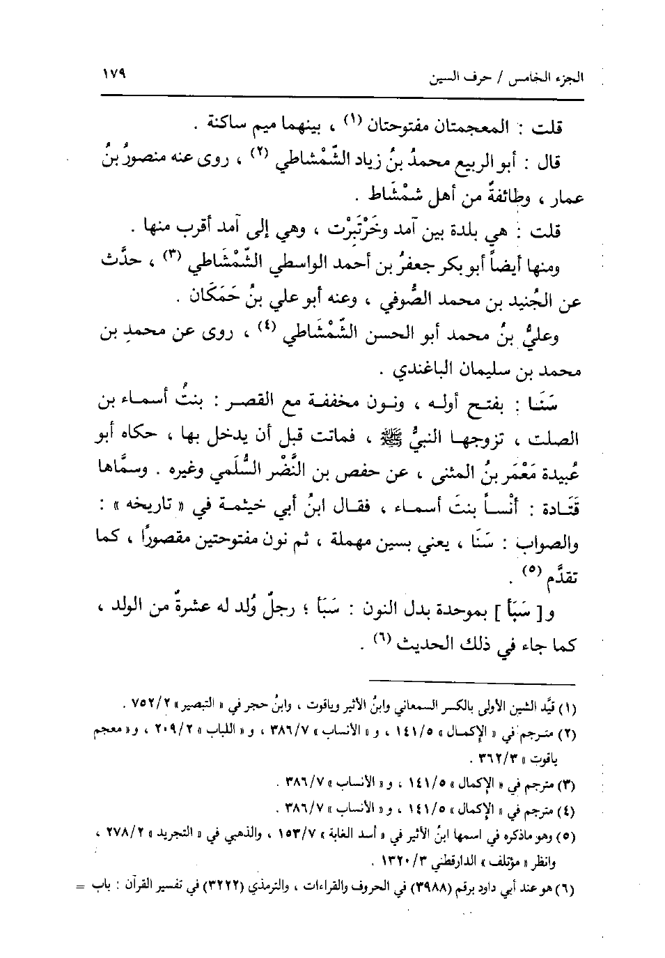 قلت: المعجمتان مفتوحتان بَينهمَا مِيم سَاكِنة. قَالَ: أَبُو الرّبيع مُحَمَّد بن زِيَاد الشمشاطي روى عَنهُ مَنْصُور بن عمار وَطَائِفَة من أهل شمشاط. قلت: هِيَ بَلْدَة بَين آمد وخرتبرت وَهِي إِلَى آمد اقْربْ مِنْهَا. وَمِنْهَا أَيْضا أَبُو بكر جَعْفَر بن أَحْمد الوَاسِطِيّ الشمشاطي حدث عَن الْجُنَيْد بن مُحَمَّد الصُّوفِي وَعنهُ أَبُو عَليّ بن حمكان. وَعلي بن مُحَمَّد أَبُو الْحسن الشمشاطي روى عَن مُحَمَّد بن مُحَمَّد بن سُلَيْمَان الباغندي. سنا: بِفَتْح أَوله وَنون مُخَفّفَة مَعَ الْقصر: بنت أَسمَاء بن الصَّلْت تزَوجهَا النَّبِي صلى الله عَلَيْهِ وَسلم ن فَمَاتَتْ قبل أَن يدْخل بهَا حَكَاهُ أَبُو عُبَيْدَة معمر بن الْمثنى عَن حَفْص بن النَّضر السّلمِيّ وَغَيره. وسماها قَتَادَة: انسا بنت اسماء فَقَالَ أبن أبي خَيْثَمَة فِي تَارِيخه: وَالصَّوَاب: سنا يَعْنِي بسين مُهْملَة ثمَّ نون مفتوحتين مَقْصُورا كَمَا تقدم. و [سبأ] بموحدة بدل النُّون: سبأ رجل ولد لَهُ عشرَة من الْوَلَد كَمَا جَاءَ فِي ذَلِك الحَدِيث.