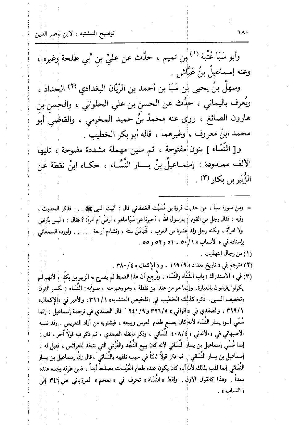 وَأَبُو سبأ عتبَة بن تَمِيم حدث عَن عَليّ بن أبي طَلْحَة وَغَيره وَعنهُ إِسْمَاعِيل بن عَيَّاش. وَسَهل بن يحيى بن سبأ بن أَحْمد بن الريان الْبَغْدَادِيّ الْحداد وَيعرف باليماني حدث عَن الْحسن بن عَليّ الْحلْوانِي وَالْحُسَيْن بن هَارُون الصَّائِغ روى عَنهُ مُحَمَّد بن حميد المخرمي وَالْقَاضِي أَبُو مُحَمَّد ابْن مَعْرُوف وَغَيرهمَا قَالَه أَبُو بكر الْخَطِيب. و [النِّسَاء] بنُون مَفْتُوحَة ثمَّ سين مُهْملَة مُشَدّدَة مَفْتُوحَة تَلِيهَا الْألف ممدودة: إِسْمَاعِيل بن يسَار النِّسَاء حَكَاهُ ابْن نقطة عَن الزبير بن بكار وَمن سُورَة سبأ من حَدِيث فَرْوَة بن مسيك الْغَطَفَانِي قَالَ أتيت النَّبِي ص فَذكر الحَدِيث وَفِيه فَقَالَ رجل من الْقَوْم يَا رَسُول الله أخبرنَا عَن سبأ مَا هُوَ أَرض أم امْرَأَة فَقَالَ لَيْسَ بِأَرْض وَلَا امْرَأَة وَلكنه رجل ولد عشرَة من الْعَرَب فتيامن سِتَّة وتشاءم أَرْبَعَة وَأوردهُ السَّمْعَانِيّ بِإِسْنَادِهِ فِي الْأَنْسَاب من دجال التَّهْذِيب مترجم فِي تَارِيخ بَغْدَاد والإكمال فِي الِاسْتِدْرَاك بَاب الشناء وَالنِّسَاء وأرجح أَن هدا الضَّبْط لم يُصَرح بِهِ الزبير بن بكار لأَنهم لم يَكُونُوا يقيدون بالعبارة وَإِنَّمَا هُوَ من عِنْد ابْن نقطة وهووهم مِنْهُ صَوَابه النِّسَاء بِكَسْر النُّون وَتَخْفِيف السِّين ذكره كَذَلِك الْخَطِيب فِي تَلْخِيص الْمُتَشَابه والأمير فِي الْإِكْمَال والصفدي فِي الوافي و 2419 قَالَ الصَّفَدِي فِي تَرْجَمَة إِسْمَاعِيل إِنَّمَا سمي أَبوهُ يسَار النِّسَاء لِأَنَّهُ كَانَ يصنع طَعَام الْعرس ويبيعه فيشتريه من أَرَادَ التَّعْرِيس وَقد نسبه الْأَصْبَهَانِيّ فِي الأغاني النَّسَائِيّ وَذكر مَا نَقله الصَّفَدِي ثمَّ ذكر فِيهِ قولا آخر تال إِنَّمَا سمي إِسْمَاعِيل بن يسَار النَّسَائِيّ لِأَنَّهُ كَانَ يَبِيع النجد والفرش الَّتِي تتَّخذ للعرائس فَقيل لَهُ إِسْمَاعِيل بن يسَار النَّسَائِيّ ثمَّ ذكر قولا ثَالِثا فِي سَبَب تلقيبه بالنسائي قَالَ ان إِسْمَاعِيل بن يسَار النَّسَائِيّ إِنَّمَا لقب بذلك لِأَن أَبَاهُ كَانَ يكون عِنْده طَعَام العرسات مصلحا ابدأ فَمن طرقه وجده عِنْده معدا وَهَذَا كالقول الأول وَلَفظ النِّسَاء تحرف فِي مُعْجم المرزبافي ص إِلَى النساب الْجُزْء الْخَامِس حرف السِّين.