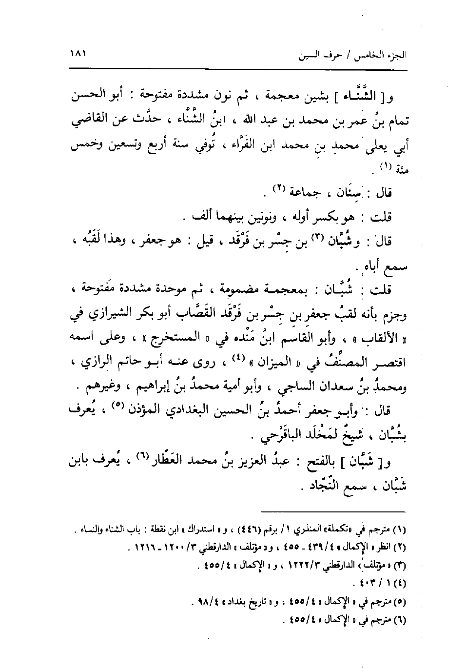 و [الشناء] بشين مُعْجمَة ثمَّ نون مُشَدّدَة مَفْتُوحَة: أَبُو الْحسن تَمام بن عمر بن مُحَمَّد بن عبد الله ابْن الشناء حدث عَن القَاضِي أبي يعلى مُحَمَّد بن مُحَمَّد ابْن الْفراء توفّي سنة أَربع وَتِسْعين وَخمْس مئة. قَالَ: سِنَان جمَاعَة. قلت: هُوَ بِكَسْر اوله ونونين بَينهمَا ألف. قَالَ: وشبان بن جسر بن فرقد قيل: هُوَ جَعْفَر وَهَذَا لقبه سمع اباه. قلت: شُبَّان: بِمُعْجَمَة مَضْمُومَة ثمَّ مُوَحدَة مُشَدّدَة مَفْتُوحَة وَجزم بِأَنَّهُ لقب جَعْفَر بن جسر بن فرقد القصاب أَبُو بكر الشِّيرَازِيّ فِي الألقاب وَأَبُو الْقَاسِم ابْن مَنْدَه فِي الْمُسْتَخْرج وعَلى اسْمه اقْتصر المُصَنّف فِي الْمِيزَان روى عَنهُ أَبُو حَاتِم الرَّازِيّ وَمُحَمّد بن سَعْدَان السَّاجِي وَأَبُو أُميَّة مُحَمَّد بن ابراهيم وَغَيرهم. قَالَ: وَأَبُو جَعْفَر أَحْمد بن الْحُسَيْن الْبَغْدَادِيّ الْمُؤَذّن يعرف بشبان شيخ لمخلد الباقرحي. و [شُبَّان] بِالْفَتْح: عبد الْعَزِيز بن مُحَمَّد الْعَطَّار يعرف بِابْن شُبَّان سمع النجاد.