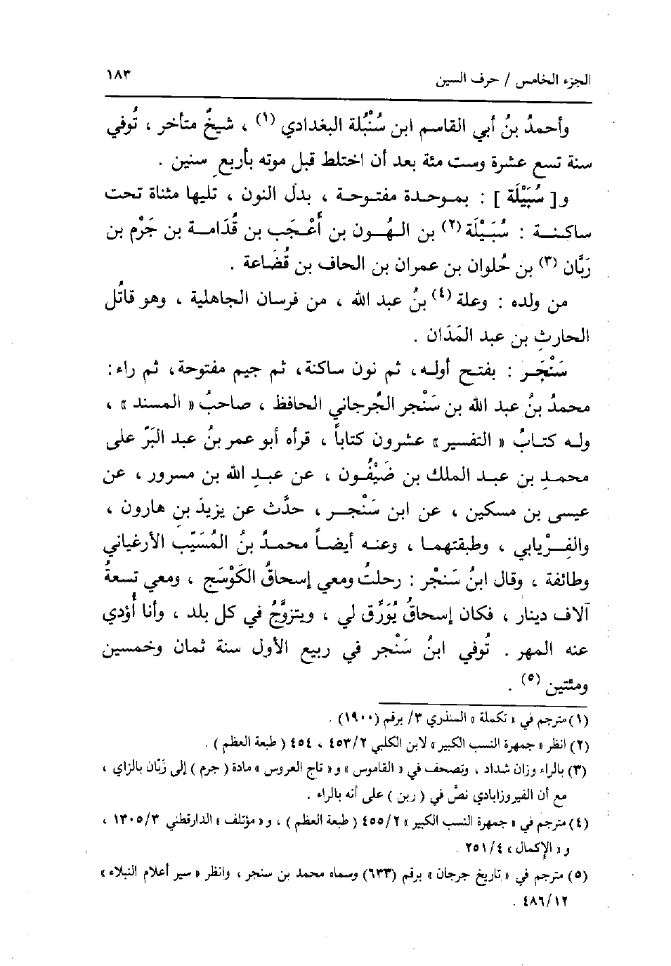 وَأحمد بن أبي الْقَاسِم ابْن سنبلة الْبَغْدَادِيّ شيخ مُتَأَخّر توفّي سنة تسع عشرَة وست مئة بعد أَن اخْتَلَط قبل مَوته باربع سِنِين. و [سبيلة] : بموحدة مَفْتُوحَة بدل النُّون تَلِيهَا مثناة تَحت سَاكِنة: سبيلة بن الْهون بن اعْجَبْ بن قدامَة بن جرم بن ربان بن حلوان بن عمرَان بن الحاف بن قضاعة. من وَلَده: وَعلة بن عبد الله من فرسَان الْجَاهِلِيَّة وَهُوَ قَاتل الْحَارِث بن عبد المدان. سنجر: بِفَتْح أَوله ثمَّ نون سَاكِنة ثمَّ جِيم مَفْتُوحَة ثمَّ رَاء: مُحَمَّد بن عبد الله بن سنجر الْجِرْجَانِيّ الْحَافِظ صَاحب الْمسند وَله كتاب التَّفْسِير عشرُون كتابا قَرَأَهُ أَبُو عمر بن عبد الْبر على مُحَمَّد بن عبد الْملك بن ضيفون عَن عبد الله بن مسرور عَن عِيسَى بن مِسْكين عَن ابْن سنجر حدث عَن يزِيد بن هَارُون وَالْفِرْيَابِي وطبقتهما وَعنهُ أَيْضا مُحَمَّد بن الْمسيب الارغياني وَطَائِفَة وَقَالَ ابْن سنجر: رحلت وَمَعِي إِسْحَاق الكوسج وَمَعِي تِسْعَة آلَاف دِينَار فَكَانَ إِسْحَاق يورق لي ويتزوج فِي كل بلد وَأَنا أؤدي عَنهُ الْمهْر. توفّي ابْن سنجر فِي ربيع الأول سنة ثَمَان وَخمسين ومئتين.