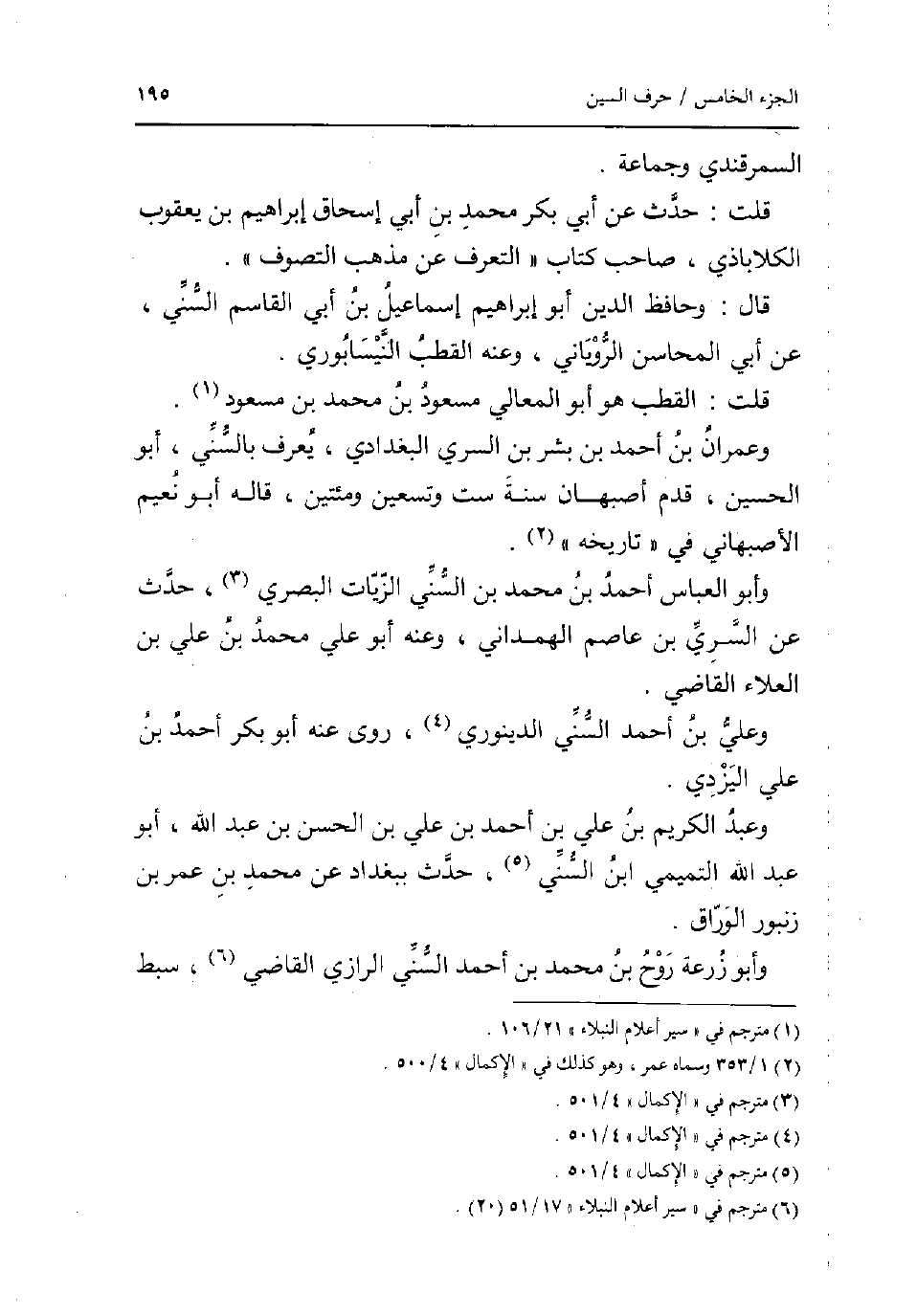 السَّمرقَنْدِي وَجَمَاعَة. قلت: حدث عَن أبي بكر مُحَمَّد بن أبي إِسْحَاق إِبْرَاهِيم بن يَعْقُوب الكلاباذي صَاحب كتاب التعرف عَن مَذْهَب التصوف. قَالَ: وحافظ الدّين أَبُو إِبْرَاهِيم إِسْمَاعِيل بن أبي الْقَاسِم السّني عَن أبي المحاسن الرَّوْيَانِيّ وَعنهُ القطب النَّيْسَابُورِي. قلت: القطب هُوَ أَبُو الْمَعَالِي مَسْعُود بن مُحَمَّد بن مَسْعُود. وَعمْرَان بن أَحْمد بن بشر بن السّري الْبَغْدَادِيّ يعرف بالسني أَبُو الْحُسَيْن قدم اصبهان سنة سِتّ وَتِسْعين ومئتين قَالَه أَبُو نعيم الاصبهاني فِي تَارِيخه. وَأَبُو الْعَبَّاس أَحْمد بن مُحَمَّد بن السّني الزيات الْبَصْرِيّ حدث عَن السّري بن عَاصِم الْهَمدَانِي وَعنهُ أَبُو عَليّ مُحَمَّد بن عَليّ بن ن الْعَلَاء القَاضِي. وَعلي بن أَحْمد السّني الدينَوَرِي روى عَنهُ أَبُو بكر أَحْمد بن عَليّ اليزدي. وَعبد الْكَرِيم بن عَليّ بن أَحْمد بن عَليّ بن الْحسن بن عبد الله أَبُو عبد الله التَّمِيمِي ابْن السّني حدث بِبَغْدَاد عَن مُحَمَّد بن عمر بن زنبور الْوراق. وَأَبُو زرْعَة روح بن مُحَمَّد بن أَحْمد السّني الرَّازِيّ القَاضِي سبط