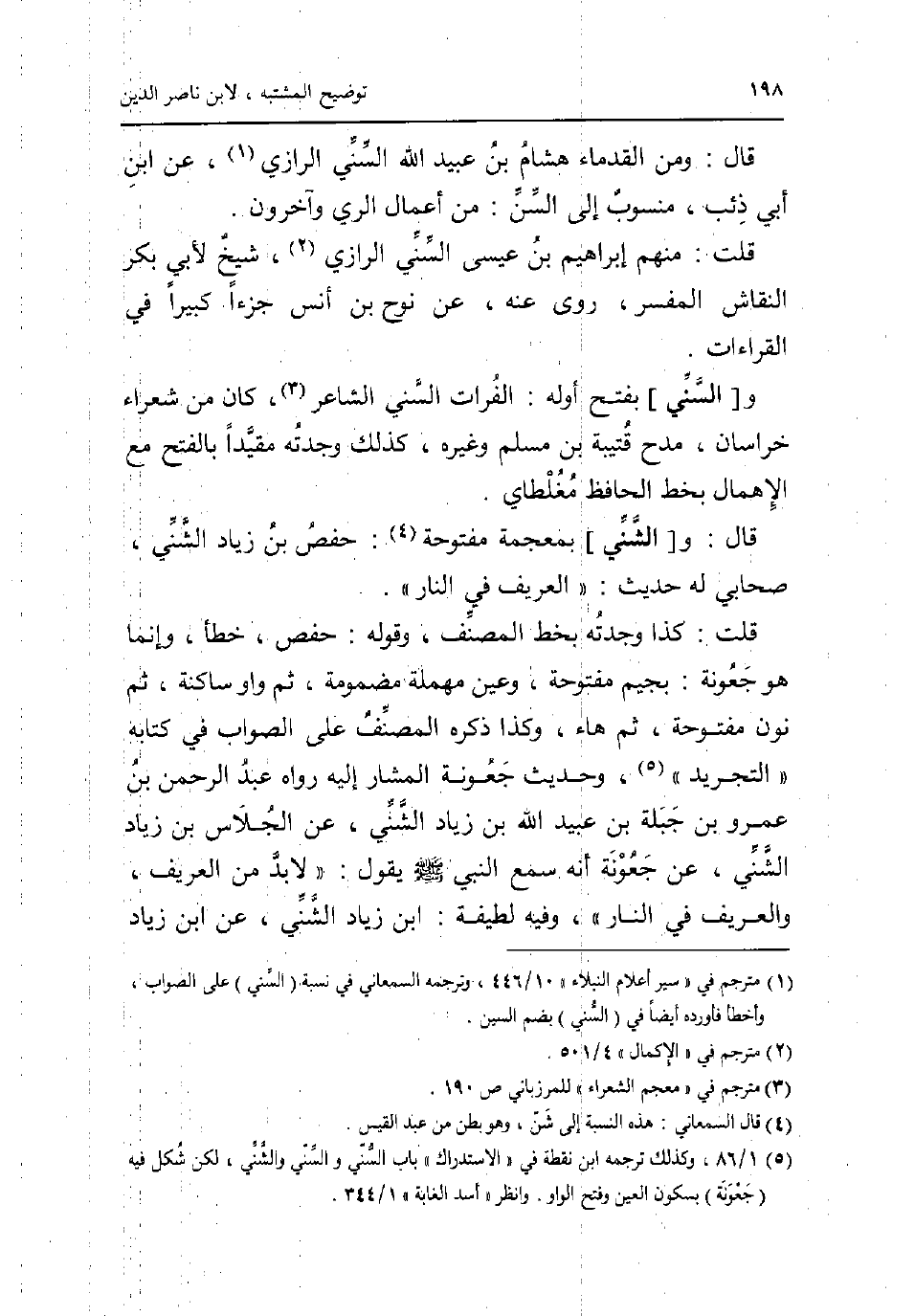 قَالَ: وَمن القدماء هِشَام بن عبيد الله السّني الرَّازِيّ عَن ابْن أبي ذِئْب مَنْسُوب إِلَى السن: من أَعمال الرّيّ وَآخَرُونَ. قلت: مِنْهُم إِبْرَاهِيم بن عِيسَى السّني الرَّازِيّ شيخ لأبي بكر النقاش الْمُفَسّر روى عَنهُ عَن نوح بن أنس جُزْءا كَبِيرا فِي الْقرَاءَات. و [السّني] بِفَتْح أَوله: الْفُرَات السّني الشَّاعِر كَانَ من شعراء خُرَاسَان مدح قُتَيْبَة بن مُسلم وَغَيره كَذَلِك وجدته مُقَيّدا بِالْفَتْح مَعَ الإهمال بِخَط الْحَافِظ مغلطاي. قَالَ: و [الشني] بِمُعْجَمَة مَفْتُوحَة: حَفْص بن زِيَاد الشني صَحَابِيّ لَهُ حَدِيث: العريف فِي النَّار. قلت: كَذَا وجدته بِخَط المُصَنّف وَقَوله: حَفْص خطأ وَإِنَّمَا هُوَ جَعونَة: بجيم مَفْتُوحَة وَعين مُهْملَة مَضْمُومَة ثمَّ وَاو سَاكِنة ثمَّ نون مَفْتُوحَة ثمَّ هَاء وَكَذَا ذكره المُصَنّف على الصَّوَاب فِي كِتَابه التَّجْرِيد وَحَدِيث جَعونَة الْمشَار إِلَيْهِ رَوَاهُ عبد الرَّحْمَن بن عَمْرو بن جبلة بن عبيد الله بن زِيَاد الشني عَن الْجلاس بن زِيَاد الشني عَن جَعونَة انه سمع النَّبِي صلى الله عَلَيْهِ وَسلم يَقُول: لَا بُد من العريف والعريف فِي النَّار وَفِيه لَطِيفَة: ابْن زِيَاد الشني عَن ابْن زِيَاد