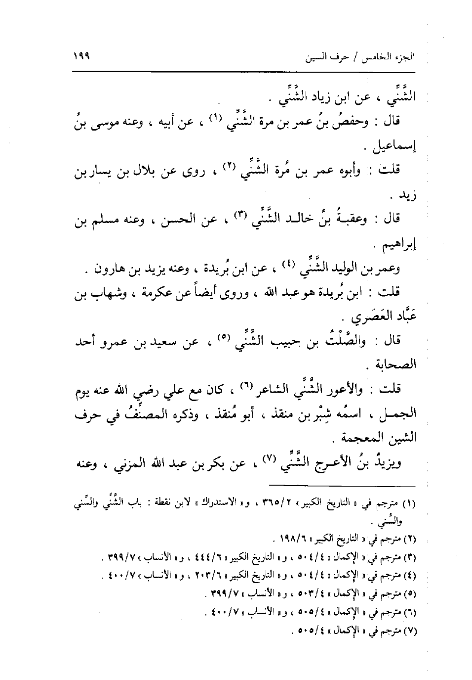 الشني عَن ابْن زِيَاد الشني. قَالَ: وَحَفْص بن عمر بن مرّة الشني عَن أَبِيه وَعنهُ مُوسَى بن إِسْمَاعِيل. قلت: وَأَبُو عمر بن مرّة الشني روى عَن بِلَال بن يسَار بن زيد. قَالَ: وَعقبَة بن خَالِد الشني عَن الْحسن وَعنهُ مُسلم بن إِبْرَاهِيم. وَعمر بن الْوَلِيد الشني عَن ابْن بُرَيْدَة وَعنهُ يزِيد بن هَارُون. قلت: ابْن بُرَيْدَة هُوَ عبد الله وروى أَيْضا عَن عِكْرِمَة وشهاب بن عباد العصري. قَالَ: والصلت بن حبيب الشني عَن سعيد بن عَمْرو أحد الصَّحَابَة. قلت: والأعور الشني الشَّاعِر كَانَ مَعَ عَليّ رَضِي الله عَنهُ يَوْم الْجمل اسْمه شبر بن منقذ أَبُو منقذ وَذكره المُصَنّف فِي حرف الشين الْمُعْجَمَة. وَيزِيد بن الْأَعْرَج الشني عَن بكر بن عبد الله الْمُزنِيّ وَعنهُ