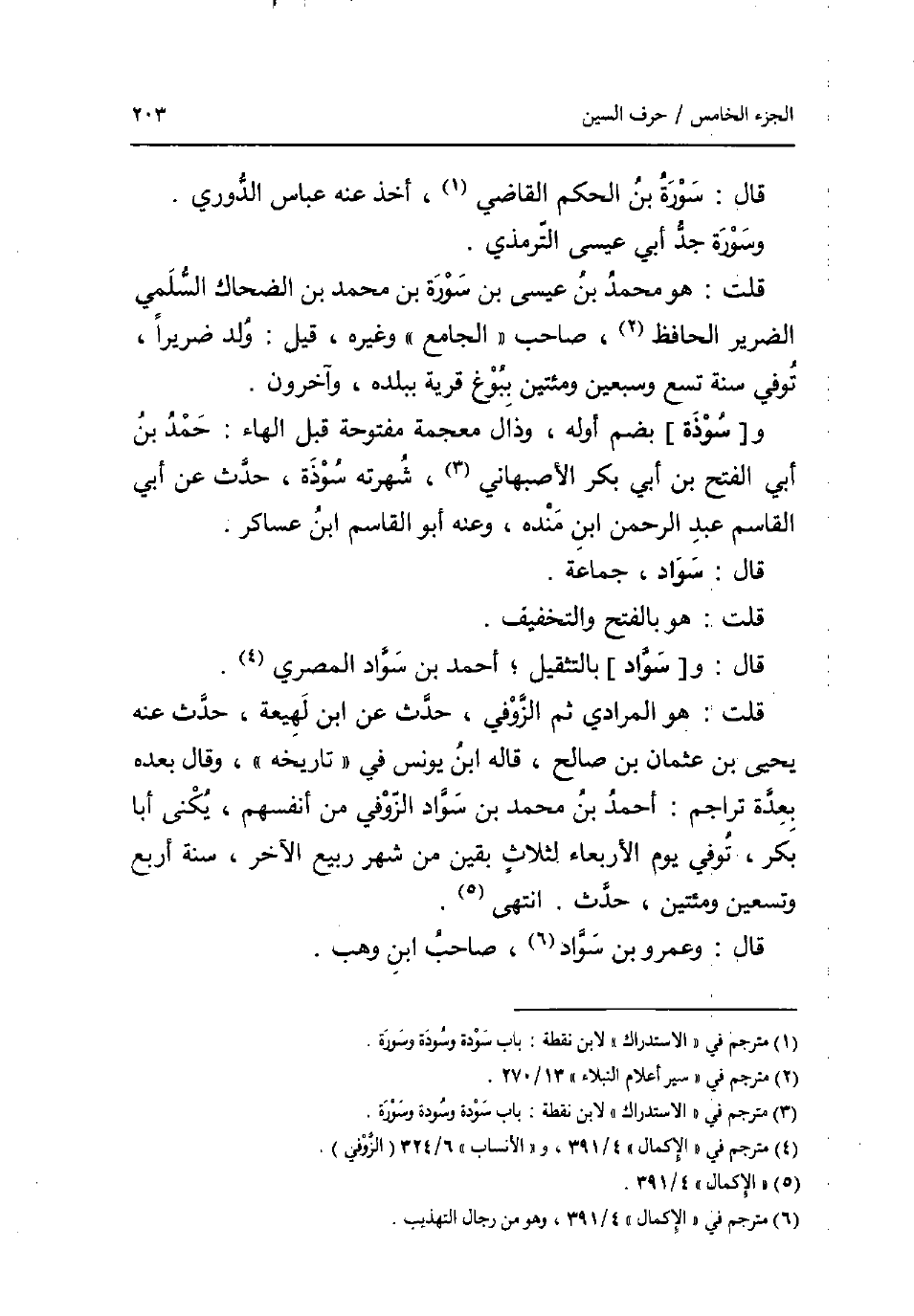 قَالَ: سُورَة بن الحكم القَاضِي اخذ عَنهُ عَبَّاس الدوري. وَسورَة جد أبي عِيسَى التِّرْمِذِيّ. قلت: هُوَ مُحَمَّد بن عِيسَى بن سُورَة بن مُحَمَّد بن الضَّحَّاك السّلمِيّ الضَّرِير الْحَافِظ صَاحب الْجَامِع وَغَيره قيل: ولد ضريرا توفّي سنة تسع وَسبعين ومئتين ببوغ قَرْيَة بِبَلَدِهِ وَآخَرُونَ و [سوذة] بِضَم اوله وذال مُعْجمَة مَفْتُوحَة قبل الْهَاء: حمد بن أبي الْفَتْح بن أبي بكر الاصبهاني شهرته سوذة حدث عَن أبي الْقَاسِم عبد الرَّحْمَن ابْن مَنْدَه وَعنهُ أَبُو الْقَاسِم ابْن عَسَاكِر. قَالَ: سَواد جمَاعَة. قلت: هُوَ بِالْفَتْح وَالتَّخْفِيف. قَالَ: و [سَواد] بالتثقيل أَحْمد بن سَواد الْمصْرِيّ قلت هُوَ الْمرَادِي ثمَّ الزوفي حدث عَن ابْن لَهِيعَة حدث عَنهُ. يحيى بن عُثْمَان بن صَالح قَالَه ابْن يُونُس فِي تَارِيخه وَقَالَ بعده بعدة تراجم: أَحْمد بن مُحَمَّد بن سَواد الزوفي من انفسهم يكنى أَبَا بكر توفّي يَوْم الْأَرْبَعَاء لثلاث بَقينَ من شهر ربيع الآخر سنة أَربع وَتِسْعين ومئتين حدث انْتهى. قَالَ: وَعَمْرو بن سَواد صَاحب ابْن وهب.