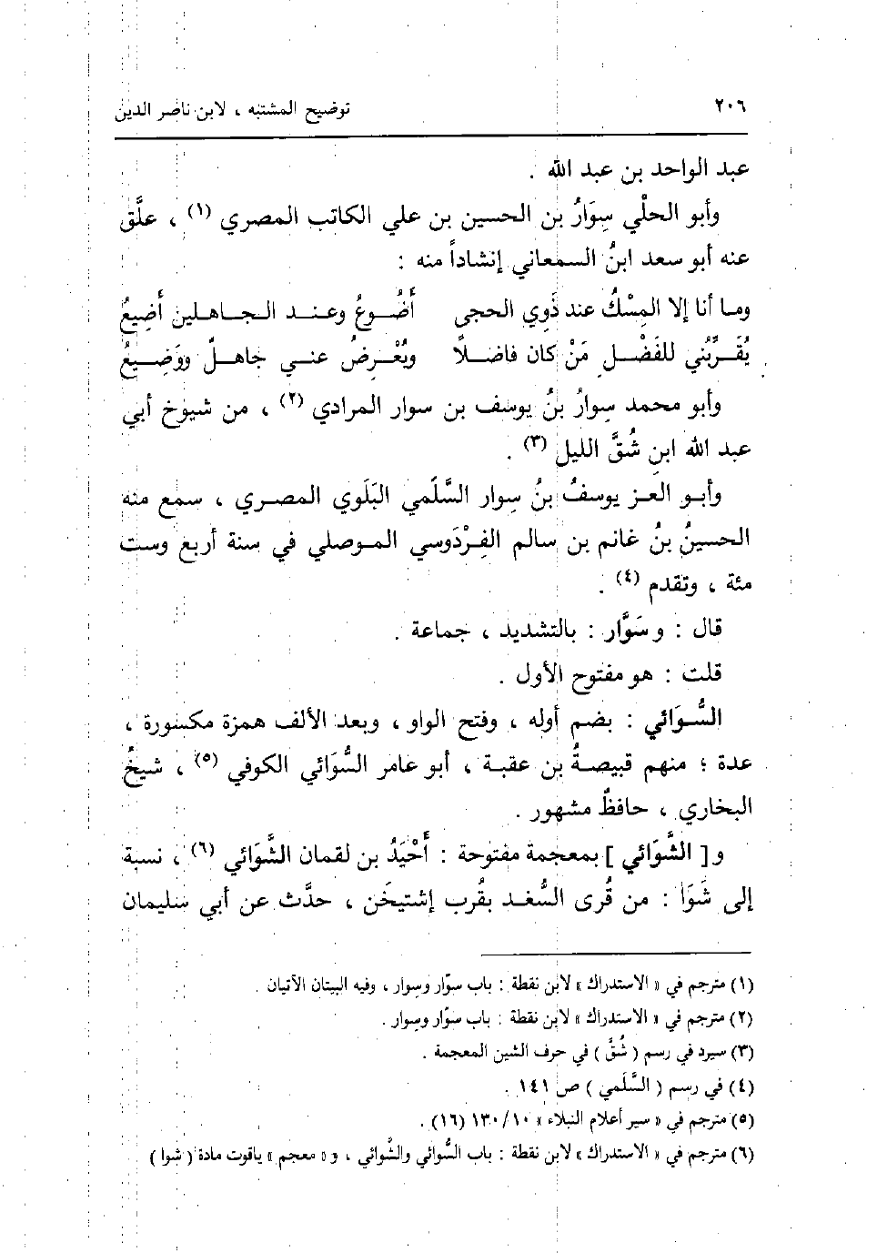 وَأَبُو مُحَمَّد سوار بن يُوسُف بن سوار الْمرَادِي من شُيُوخ أبي عبد الله ابْن شقّ اللَّيْل. وَأَبُو الْعِزّ يُوسُف بن سوار السّلمِيّ البلوي الْمصْرِيّ سمع مِنْهُ الْحُسَيْن بن غَانِم بن سَالم الفردوسي الْموصِلِي فِي سنة أَربع وست مئة وَتقدم. قَالَ: وسوار: بِالتَّشْدِيدِ جمَاعَة. قلت: هُوَ مَفْتُوح الأول. السوَائِي: بِضَم أَوله وَفتح الْوَاو وَبعد الْألف همزَة مَكْسُورَة عدَّة مِنْهُم قبيصَة بن عقبَة أَبُو عَامر السوَائِي الْكُوفِي شيخ البُخَارِيّ حَافظ مَشْهُور. و [الشوائي] بِمُعْجَمَة مَفْتُوحَة: احيد بن لُقْمَان الشوائي نِسْبَة إِلَى شوا: من قرى السغد بِقرب إشتيخن حدث عَن أبي سُلَيْمَان