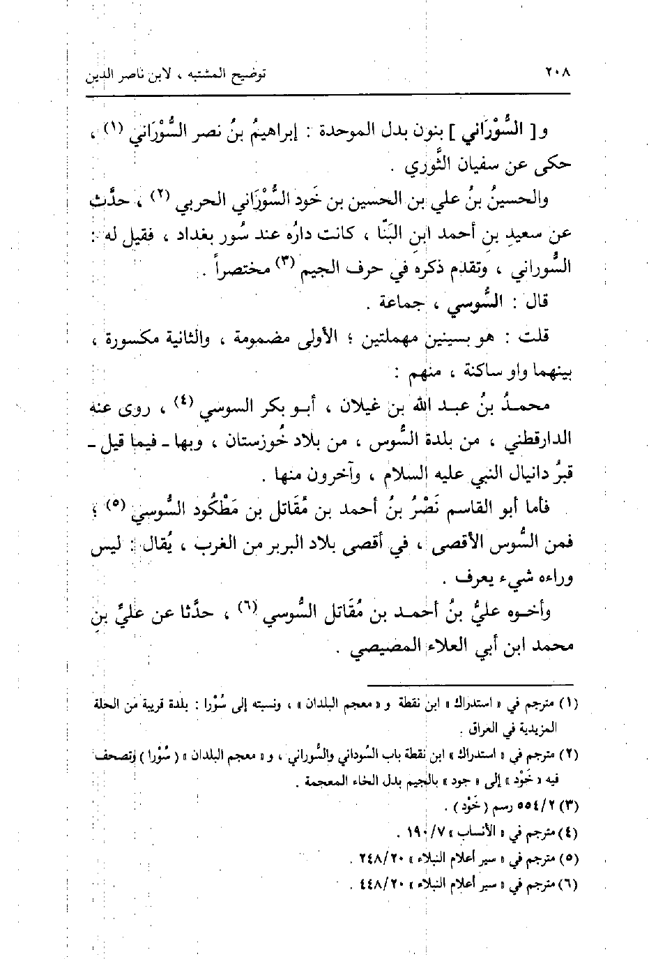 و [السوراني] بنُون بدل الْمُوَحدَة: إِبْرَاهِيم بن نصر السوراني حكى عَن سُفْيَان الثَّوْريّ. وَالْحُسَيْن بن عَليّ بن الْحُسَيْن بن خود السوراني الْحَرْبِيّ حدث عَن سعيد بن أَحْمد ابْن الْبَنَّا كَانَت دَاره عِنْد سور بَغْدَاد فَقيل لَهُ: السوراني وَتقدم ذكره فِي حرف الْجِيم مُخْتَصرا. قَالَ: السُّوسِي جمَاعَة. قلت: هُوَ بسينين مهملتين الأولى مَضْمُومَة وَالثَّانيَِة مَكْسُورَة بَينهمَا وَاو سَاكِنة مِنْهُم: مُحَمَّد بن عبد الله بن غيلَان ابوبكر السُّوسِي روى عَنهُ الدَّارَقُطْنِيّ من بَلْدَة السوس من بِلَاد خوزستان وَبهَا - فِيمَا قيل - قبر دانيال النَّبِي عَلَيْهِ السَّلَام وَآخَرُونَ مِنْهَا. فَأَما أَبُو الْقَاسِم نصر بن أَحْمد بن مقَاتل بن مطكود السُّوسِي فَمن السوس الاقصى فِي أقْصَى بِلَاد البربر من الغرب يُقَال: لَيْسَ وَرَاءه شَيْء يعرف. واخوه عَليّ بن أَحْمد بن مقَاتل السُّوسِي حَدثا عَن عَليّ بن مُحَمَّد ابْن أبي الْعَلَاء المصِّيصِي.