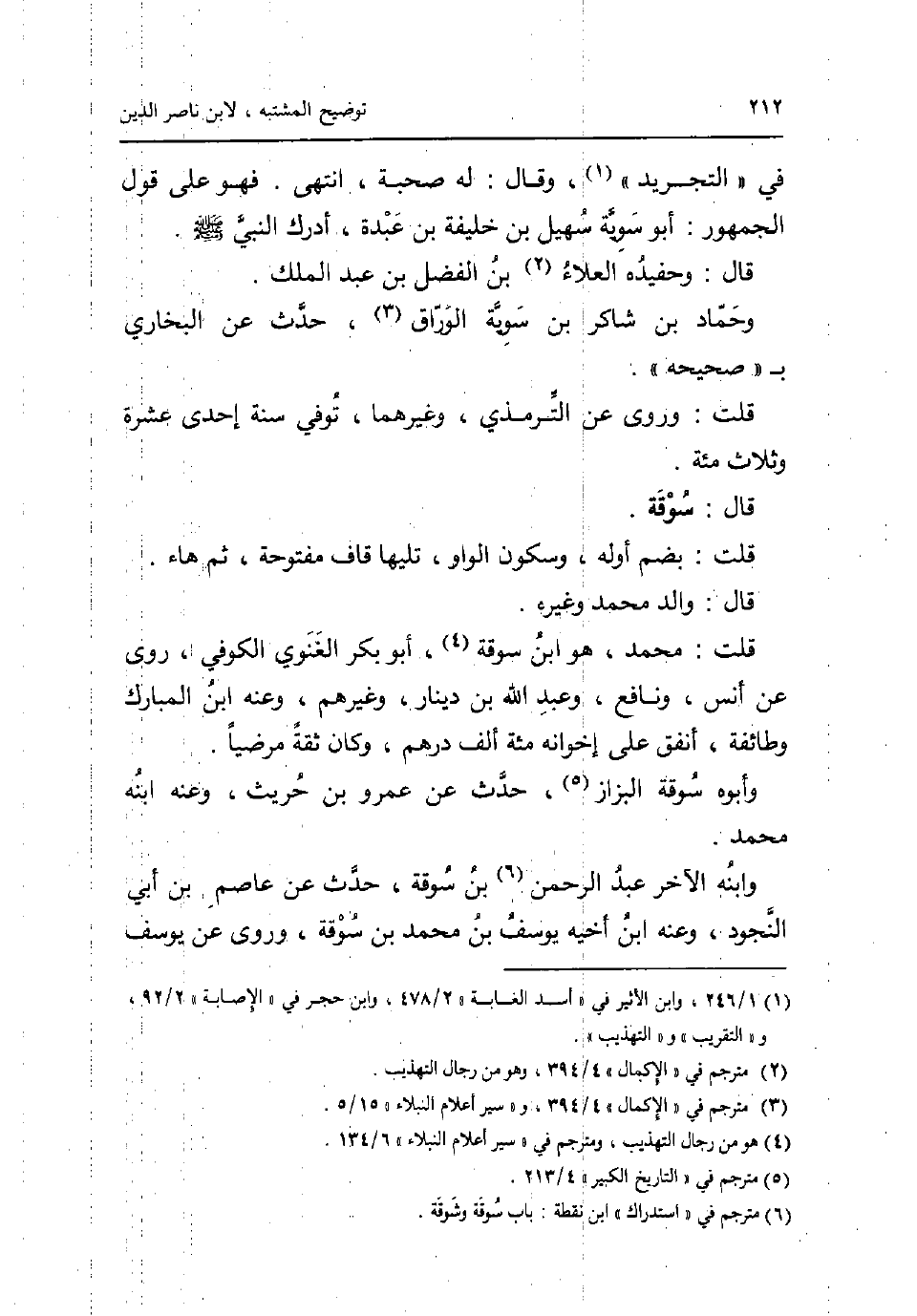 فِي التَّجْرِيد وَقَالَ: لَهُ صُحْبَة انْتهى. فَهُوَ على قَول الْجُمْهُور: أَبُو سوية سُهَيْل بن خَليفَة بن عَبدة أدْرك النَّبِي صلى الله عَلَيْهِ وَسلم. قَالَ: وحفيده الْعَلَاء بن الْفضل بن عبد الْملك. وَحَمَّاد بن شَاكر بن سوية الْوراق حدث عَن البُخَارِيّ ب صَحِيحه. قلت: وروى عَن التِّرْمِذِيّ وَغَيرهمَا توفّي سنة إِحْدَى عشرَة وَثَلَاث مئة. قَالَ: سوقة. قلت: بِضَم اوله وَسُكُون الْوَاو تَلِيهَا قَاف مَفْتُوحَة ثمَّ هَاء. قَالَ: وَالِد مُحَمَّد وَغَيره. قلت: مُحَمَّد هُوَ ابْن سوقة أَبُو بكر الغنوي الْكُوفِي روى عَن انس وَنَافِع وَعبد الله بن دِينَار وَغَيرهم وَعنهُ ابْن الْمُبَارك وَطَائِفَة انفق على إخوانه مئة الف دِرْهَم وَكَانَ ثِقَة مرضيا. وَأَبوهُ سوقة الْبَزَّاز حدث عَن عَمْرو بن حُرَيْث وَعنهُ ابْنه مُحَمَّد. وَابْنه الآخر عبد الرَّحْمَن بن سوقة حدث عَن عَاصِم بن أبي النجُود وَعنهُ ابْن أَخِيه يُوسُف بن مُحَمَّد بن سوقة وروى عَن يُوسُف