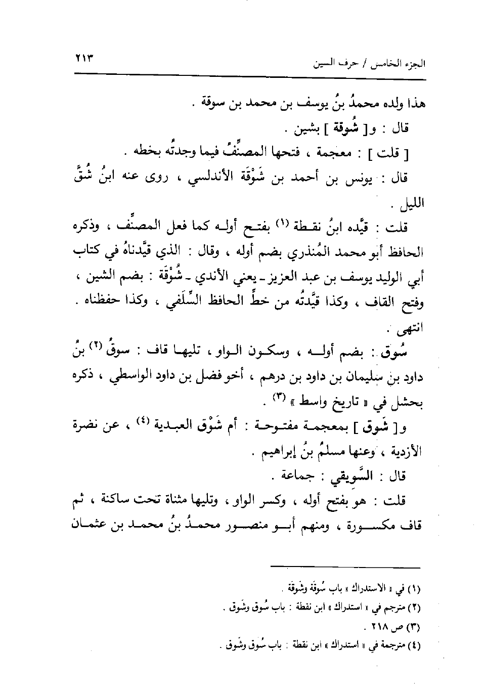 هَذَا وَلَده مُحَمَّد بن يُوسُف بن مُحَمَّد بن سوقة. قَالَ: و [شوقة] بشين. [قلت] : مُعْجمَة فتحهَا المُصَنّف فِيمَا وجدته بِخَطِّهِ. قَالَ: يُونُس بن أَحْمد بن شوقة الاندلسي روى عَنهُ ابْن شقّ اللَّيْل. قلت: قَيده ابْن نقطة بِفَتْح أَوله كَمَا فعل المُصَنّف وَذكره الْحَافِظ أَبُو مُحَمَّد الْمُنْذِرِيّ بِضَم اوله وَقَالَ: الَّذِي قيدناه فِي كتاب أبي الْوَلِيد يُوسُف بن عبد الْعَزِيز - يَعْنِي الاندي - شوقة: بِضَم الشين وَفتح الْقَاف وَكَذَا قيدته من خطّ الْحَافِظ السلَفِي وَكَذَا حفظناه. انْتهى. سوق: بِضَم اوله وَسُكُون الْوَاو تَلِيهَا قَاف: سوق بن دَاوُد بن سُلَيْمَان بن دَاوُد بن دِرْهَم أَخُو فضل بن دَاوُد الوَاسِطِيّ ذكره بحشل فِي تَارِيخ وَاسِط. و [شوق] بِمُعْجَمَة مَفْتُوحَة: أم شوق العبدية عَن نَضرة الازدية وعنها مُسلم بن إِبْرَاهِيم. قَالَ: السويقي: جمَاعَة. قلت: هُوَ بِفَتْح اوله وَكسر الْوَاو وتليها مثناة تَحت سَاكِنة ثمَّ قَاف مَكْسُورَة وَمِنْهُم أَبُو مَنْصُور مُحَمَّد بن مُحَمَّد بن عُثْمَان